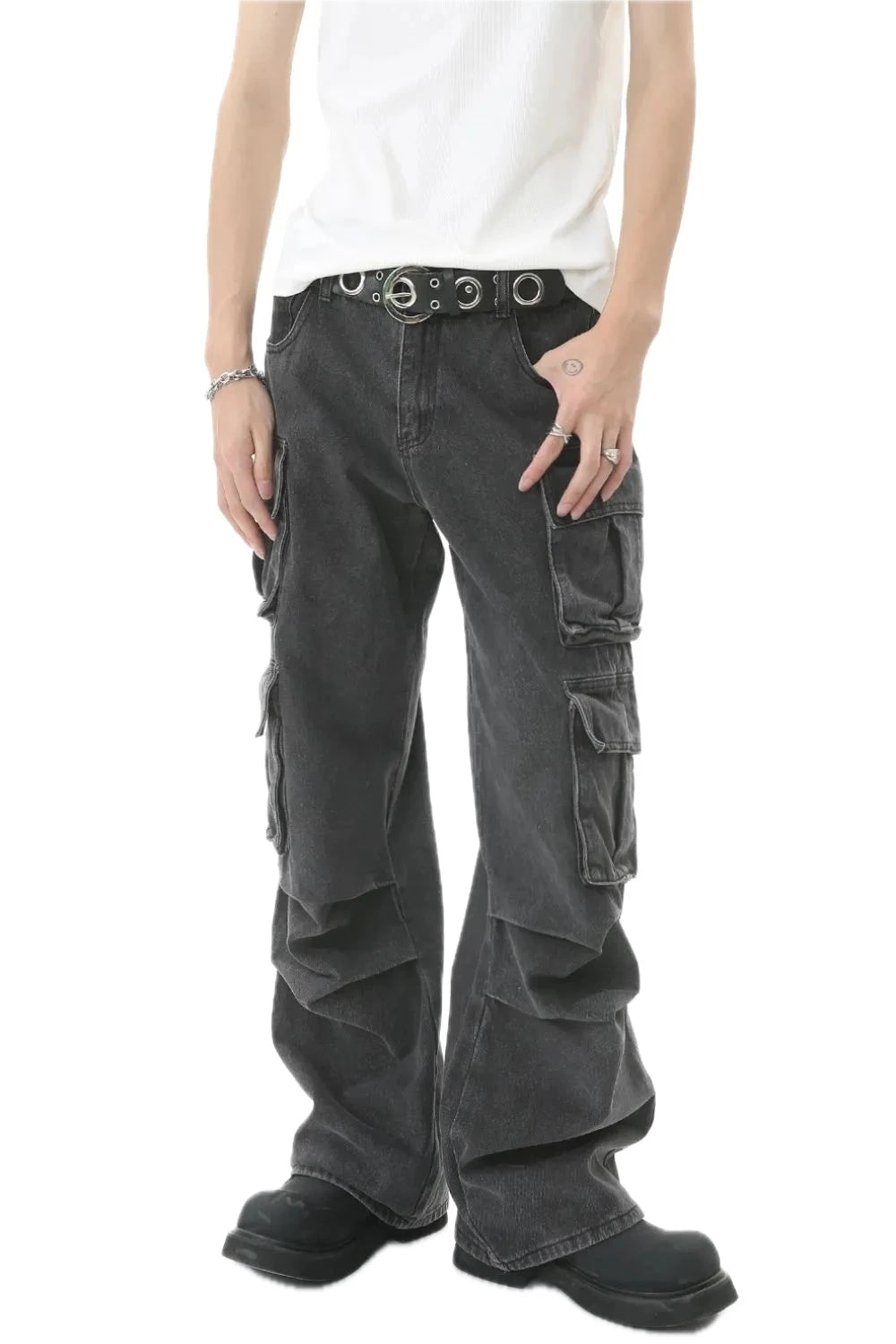Mens Relaxed Fit Cargo Jeans with Pleated Design and Multiple Pocket Durable Denim for Casual Outdoor Work Everyday Wear