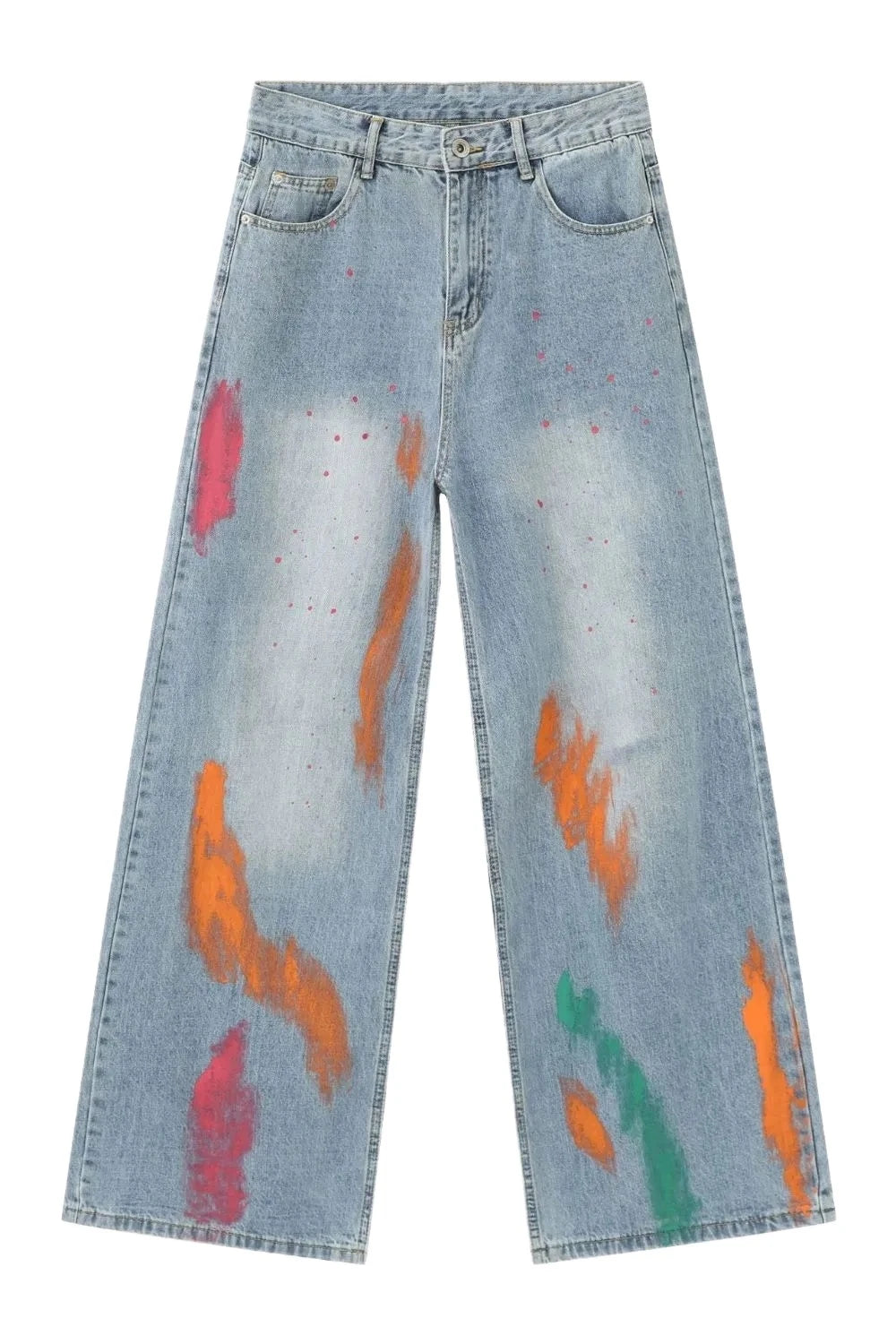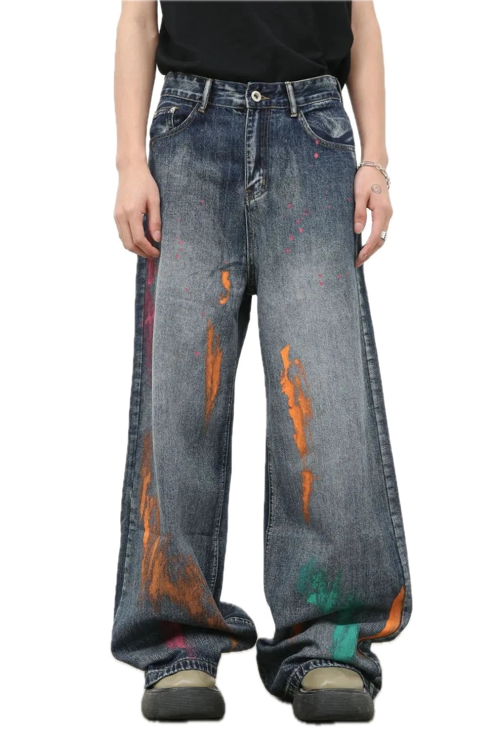 Mens Splash Print Wide Leg Jeans Loose Fit Denim Pants with Pockets Durable Casual Streetwear Trousers Modern Style