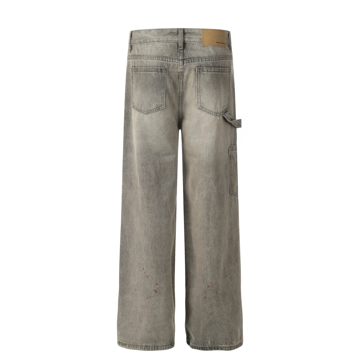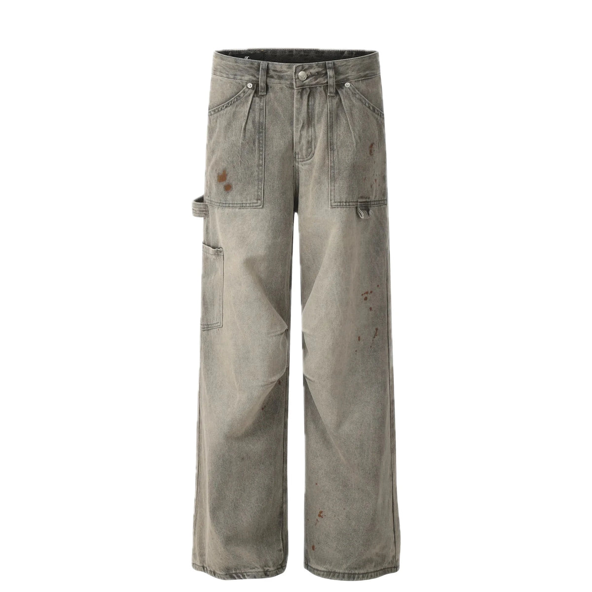 Mens Vintage Washed Cargo Pocket Wide Leg Jeans Durable Denim Pants for Casual Everyday Relaxed Fit Everyday Wearable