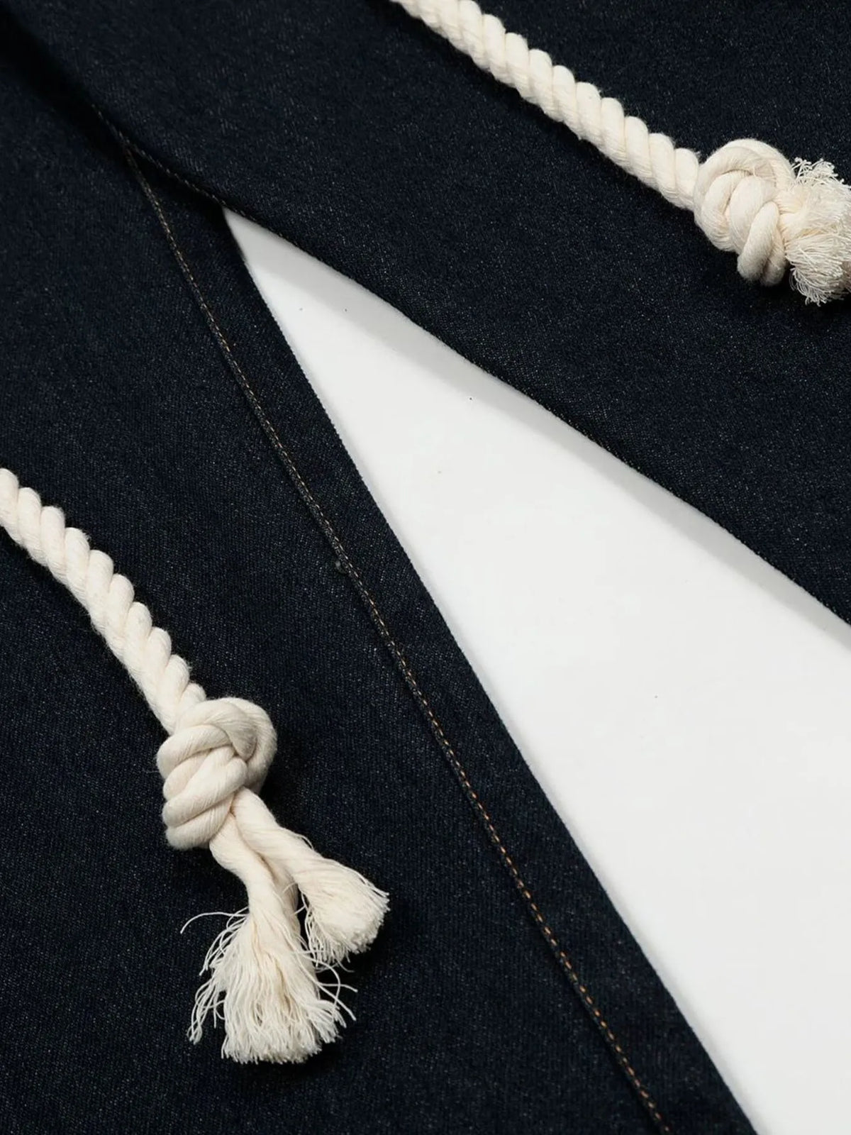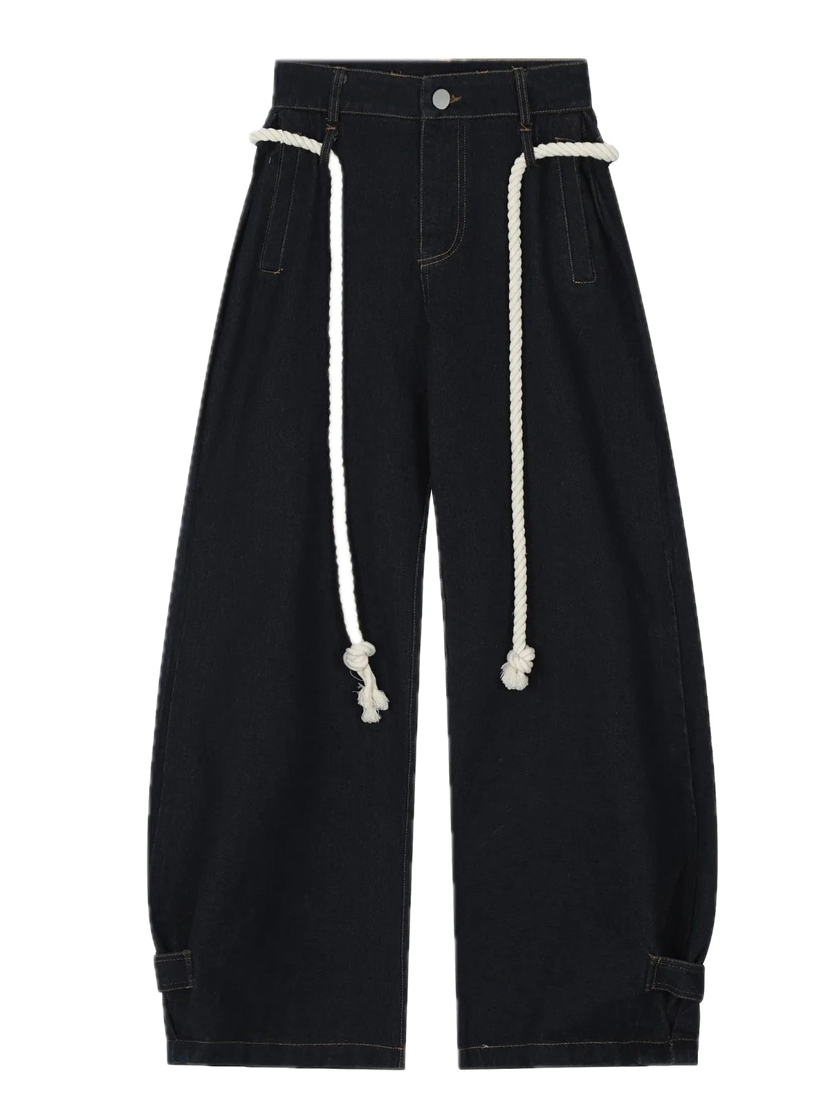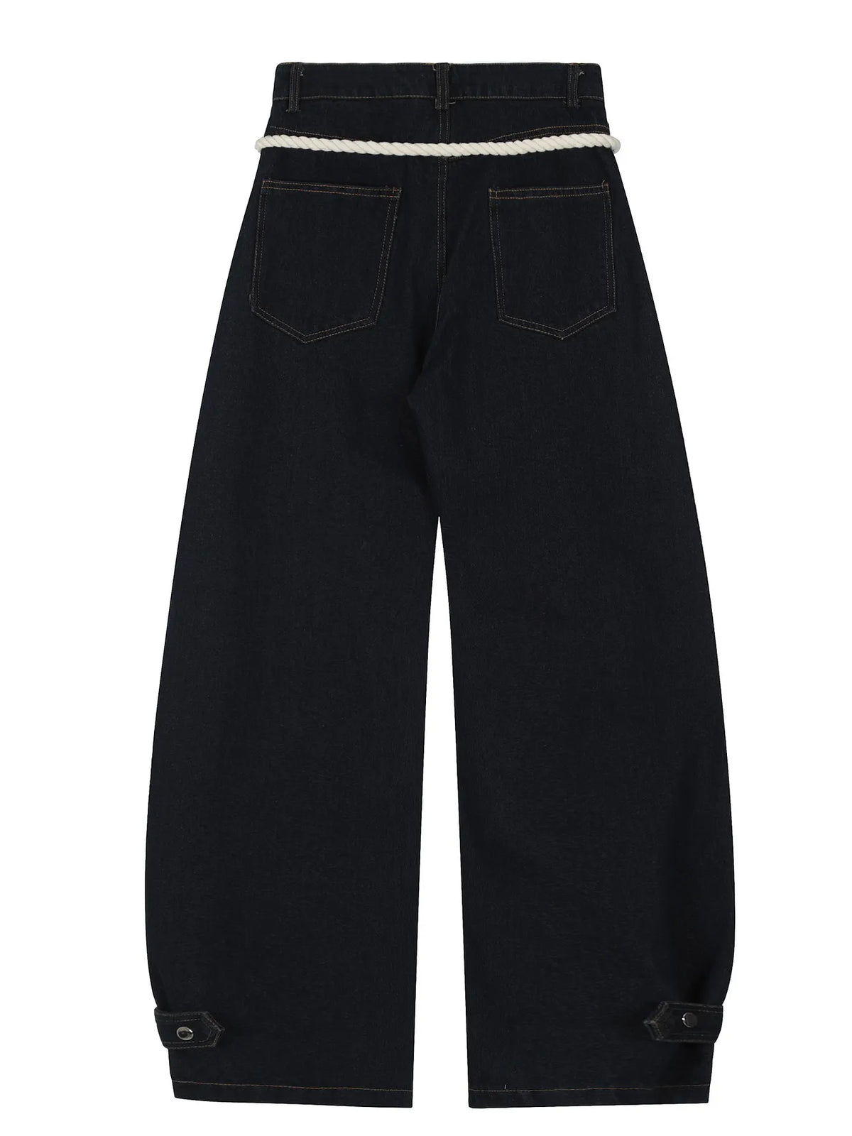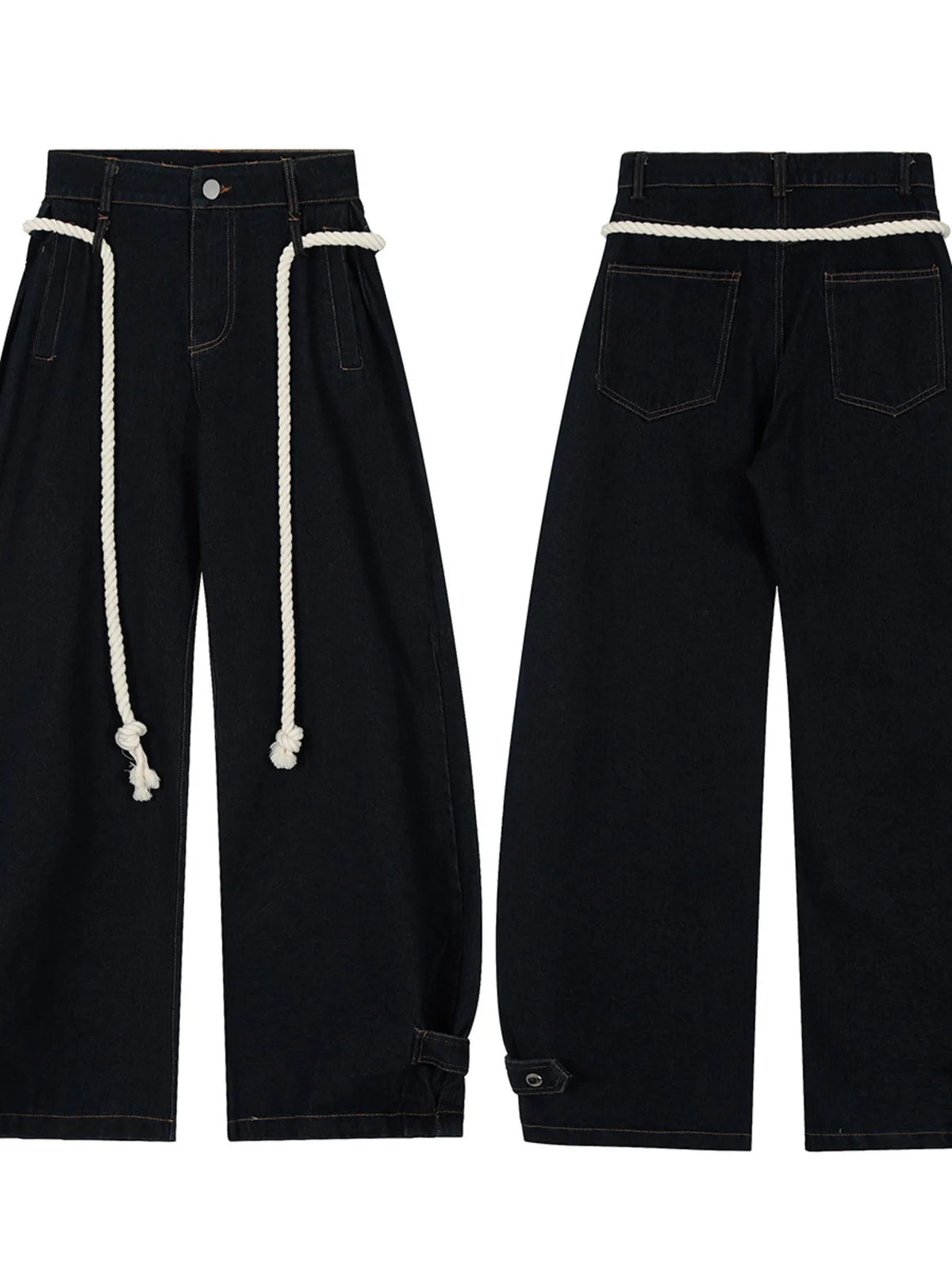 Men Wide Leg Baggy Jeans with Oversized Pockets Rope Belt Durable Denim Pants Casual Everyday Relaxed Fit Wear