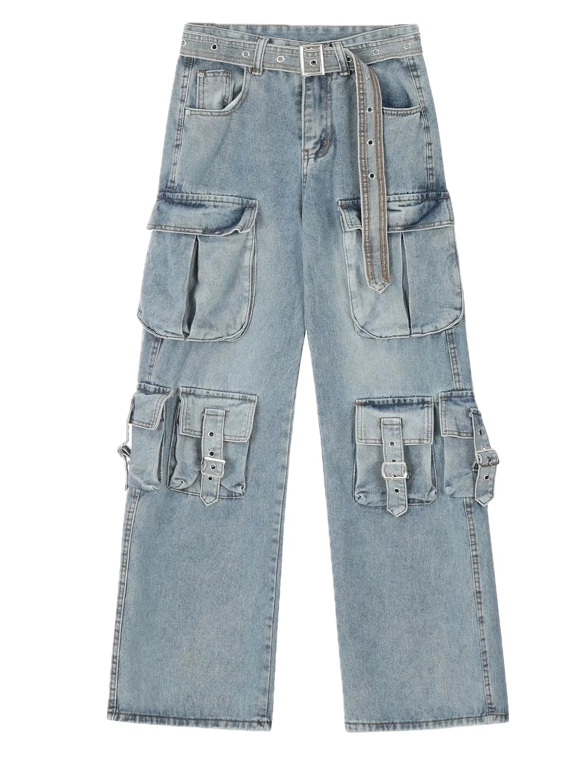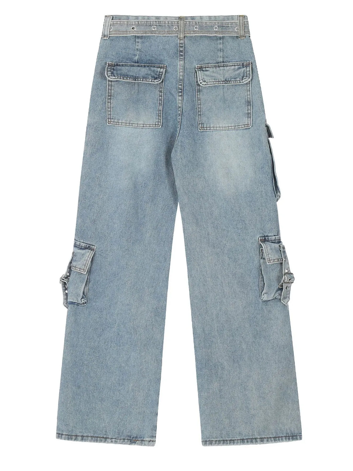 Mens Wide Leg Cargo Jeans with Pocketed Stretchy Durable Denim Casual Loose Fit Pants for Daily Wear Outdoor Activities