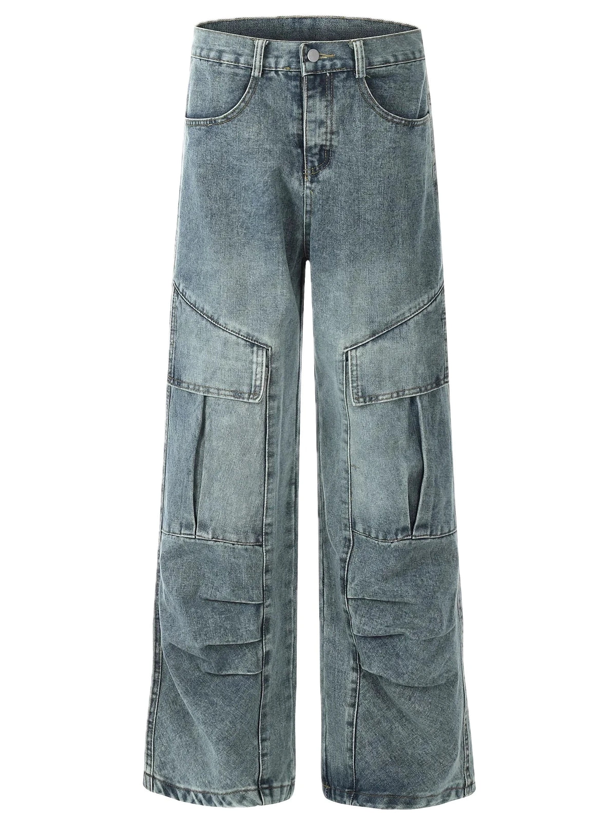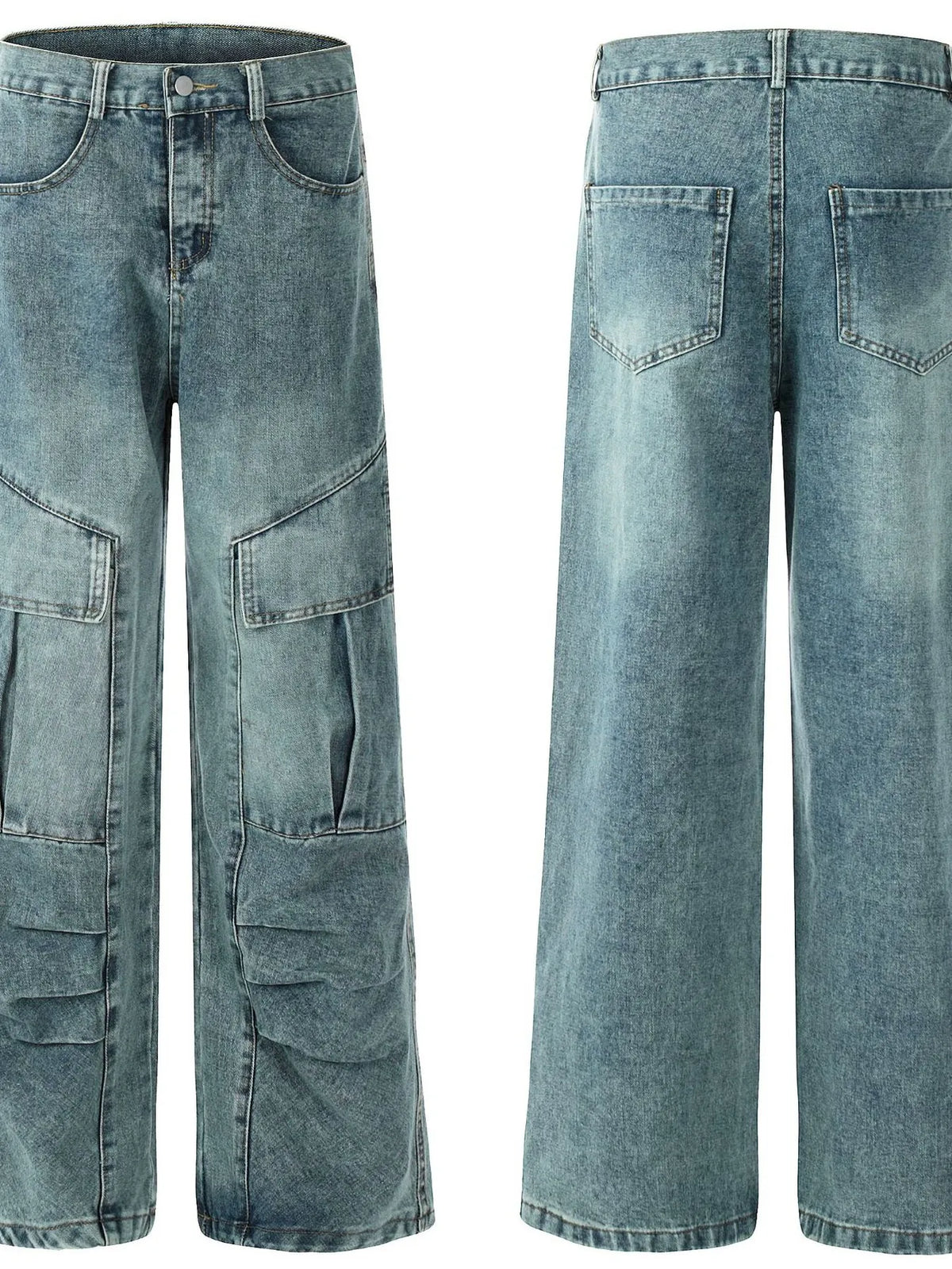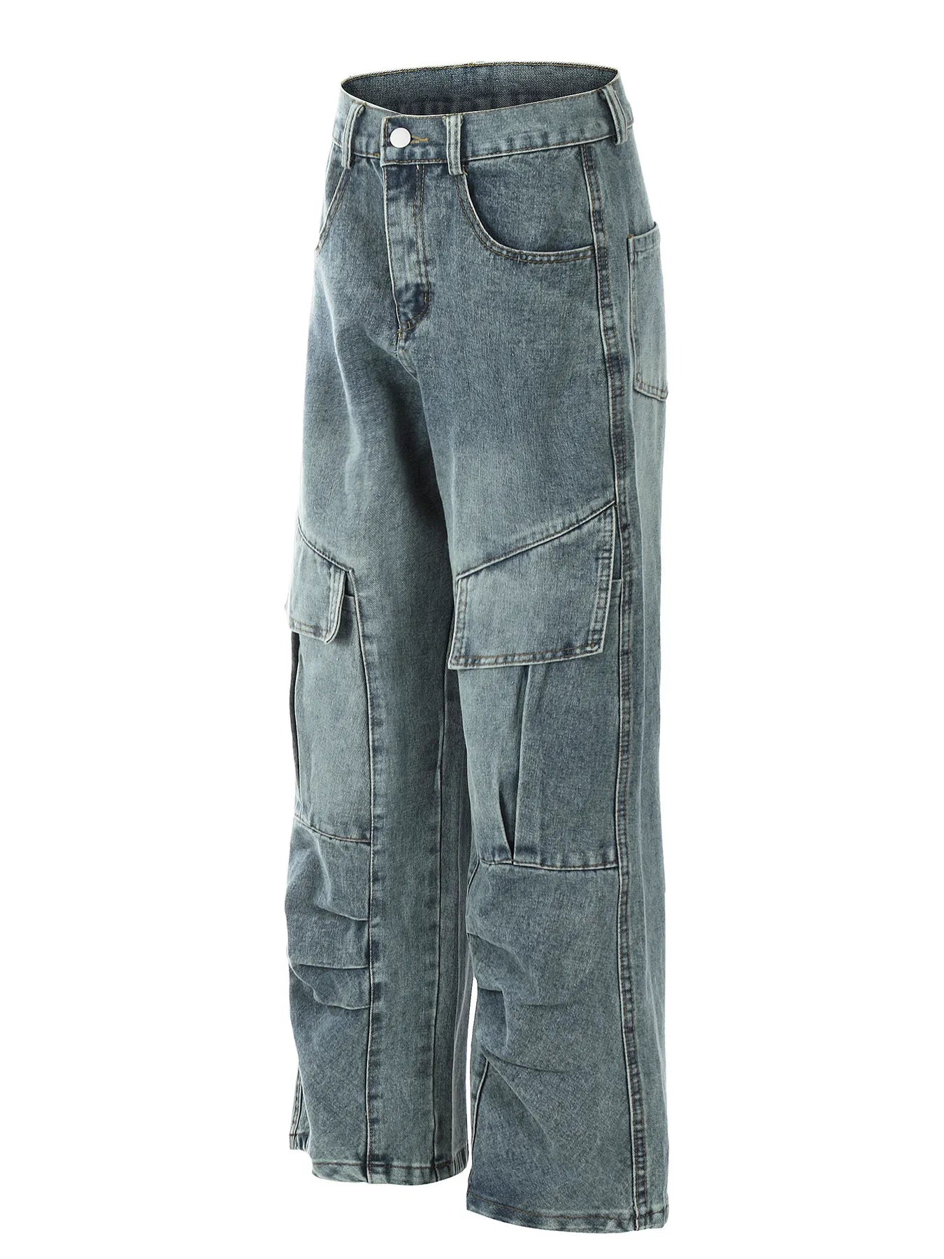 Men Wide Leg Cargo Jeans with Pockets Washed Durable Slightly Stretchy Everyday Outdoor Pants Versatile Casual Wear