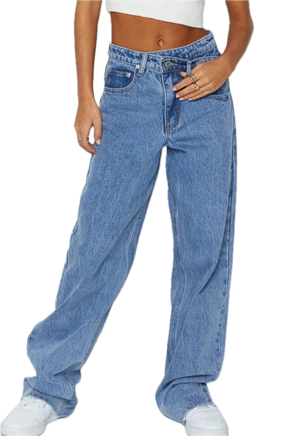 Womens Mid Rise Asymmetrical Waist Wide Leg Jeans for Casual Everyday Wear Modern Fashion Chic Design Durable Denim