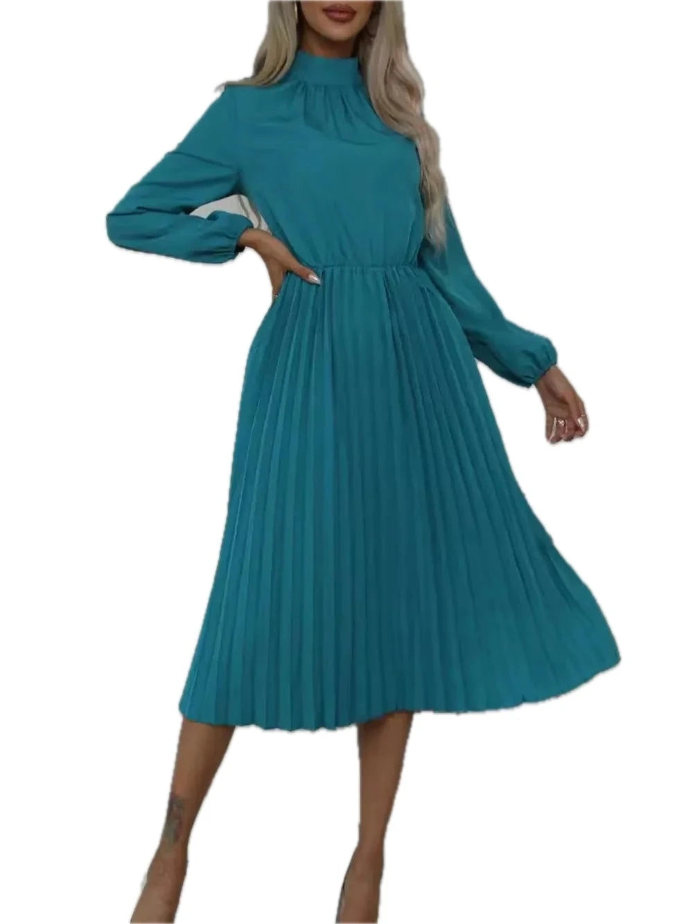 Women's Mock Neck Long Sleeve Pleated Dress with Stretch Fabric Ninety Five Percent Polyester and Five Percent Spandex