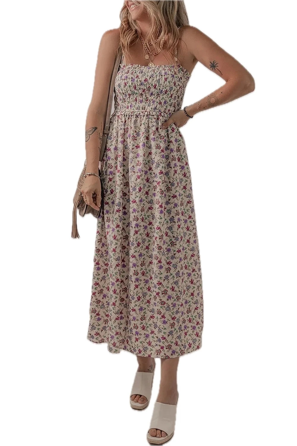 Women's Bohemian Ditsy Floral Smocked Fit Flare Sundress in Colorful Print with 100% Polyester Fabric for Summer