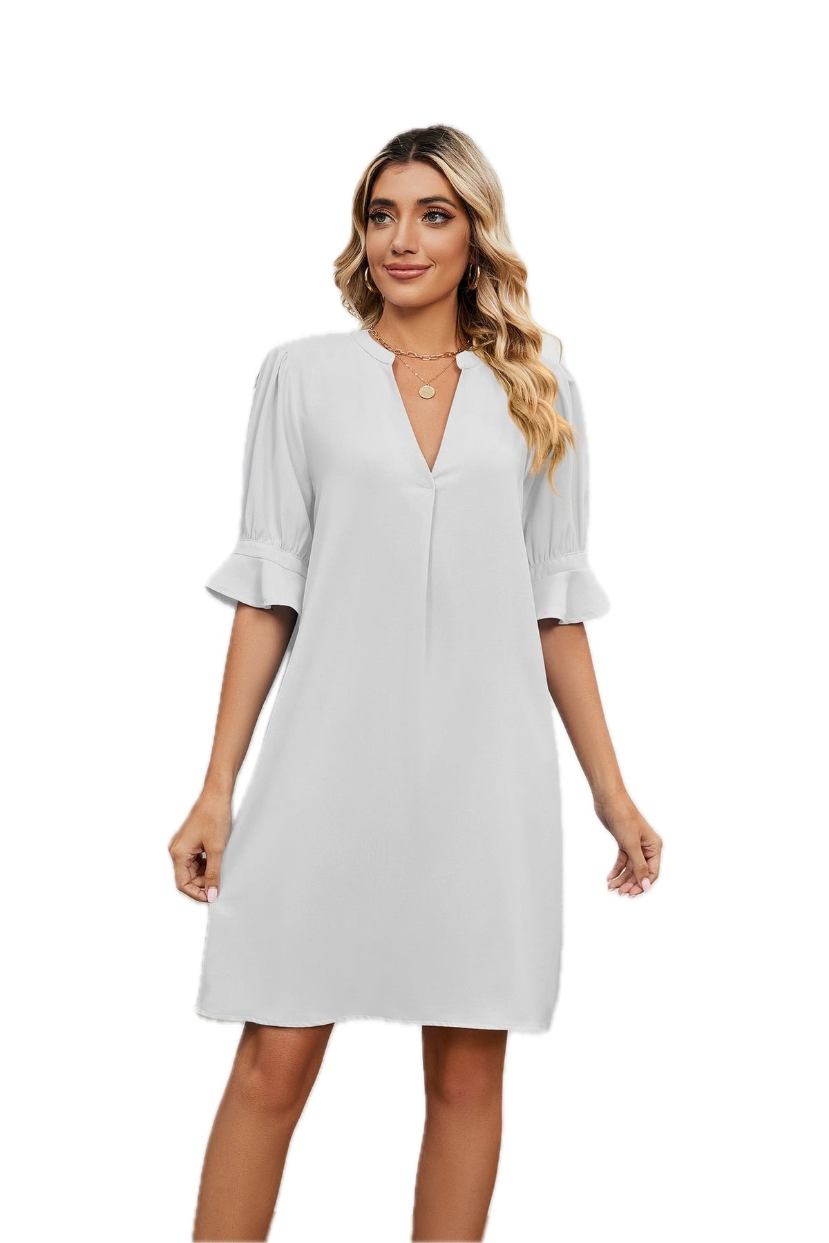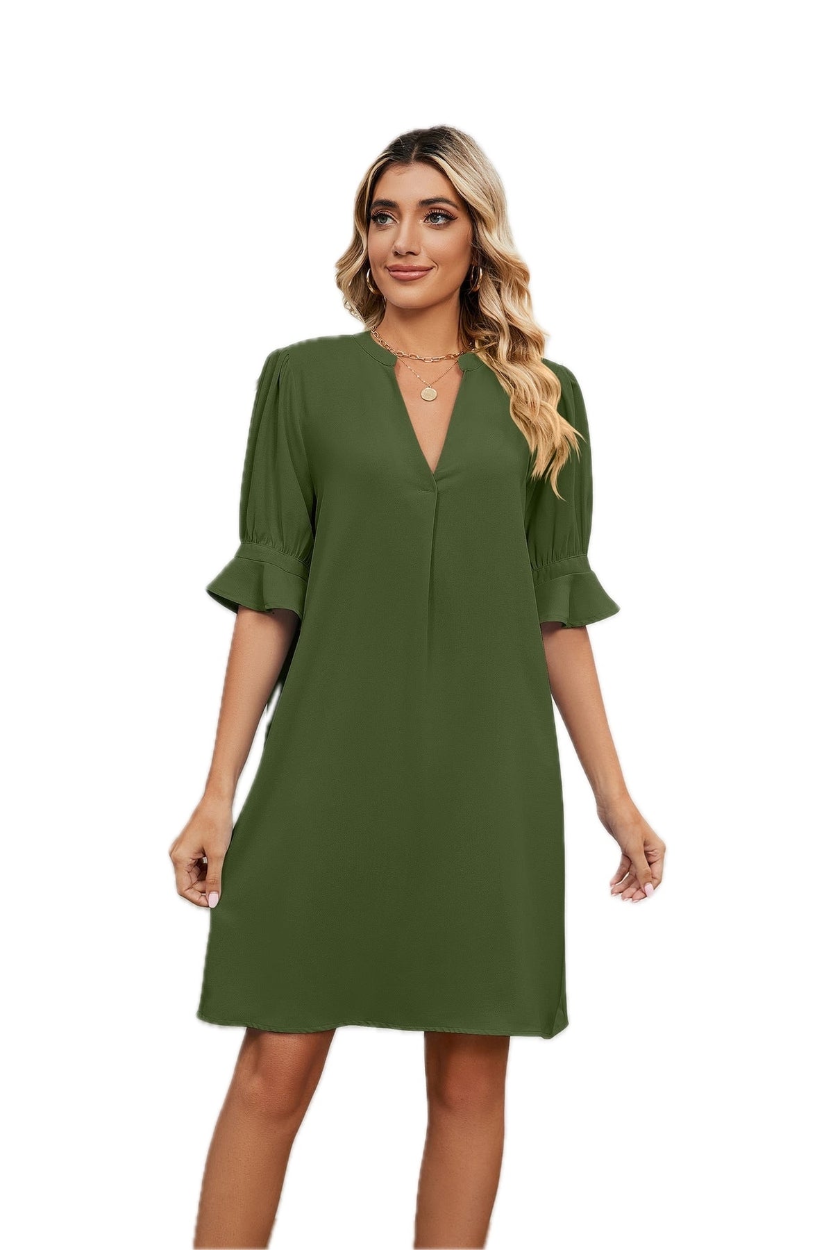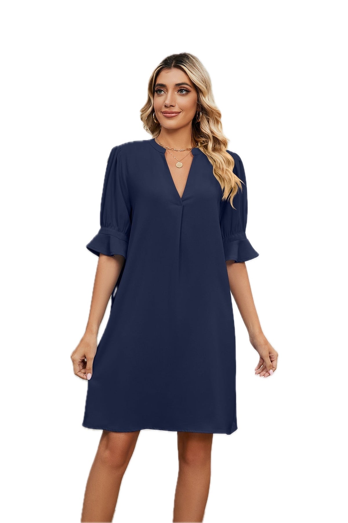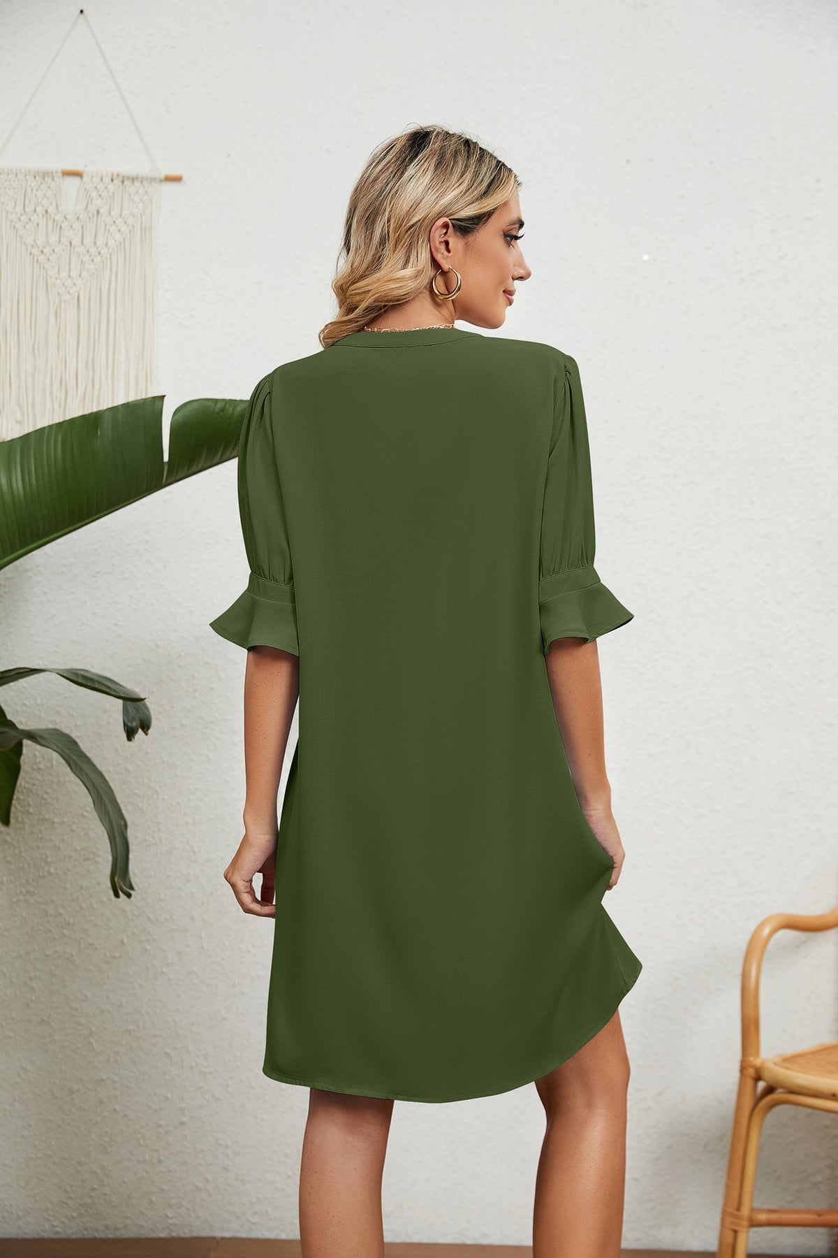 Women's Notched Neck Flounce Sleeve Knee Length Dress 100% Polyester Casual Chic Everyday Wear Ideal for Work or Weekend