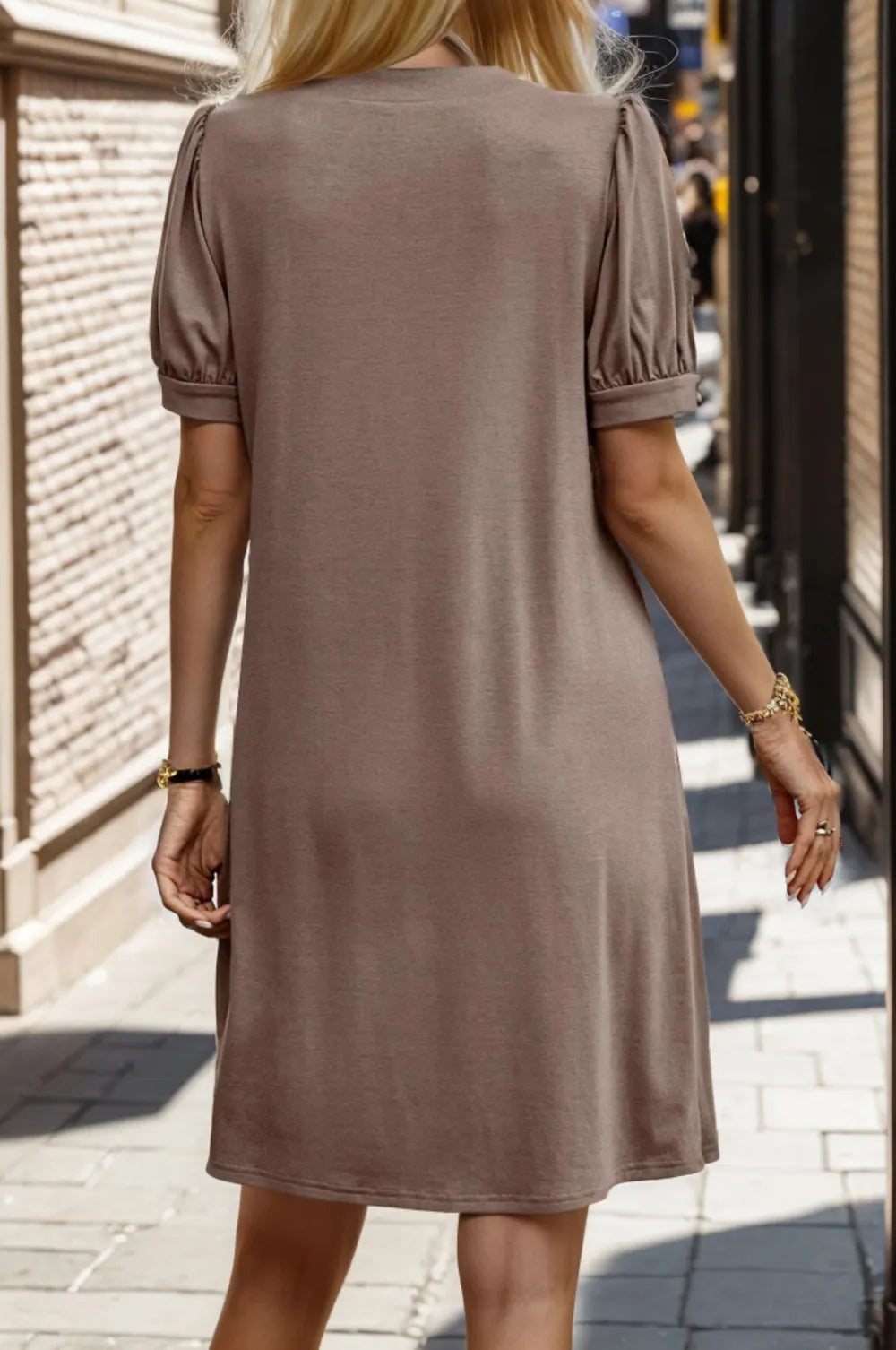 Women's Notched Short Sleeve Dress Feminine Everyday Style with Sixty Five Percent Polyester Sixty Percent Viscose Five Percent Spandex