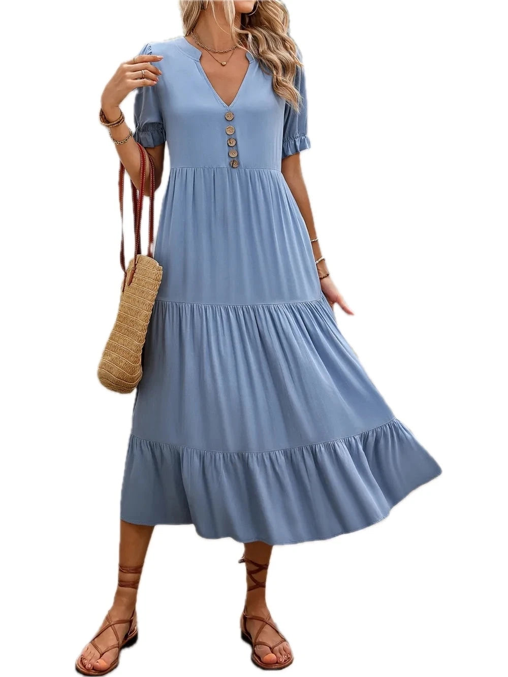 Women's Notched Short Sleeve Tiered Midi Dress with Ruffles and Decorative Buttons Opaque Stretch Viscose 100% Fabric