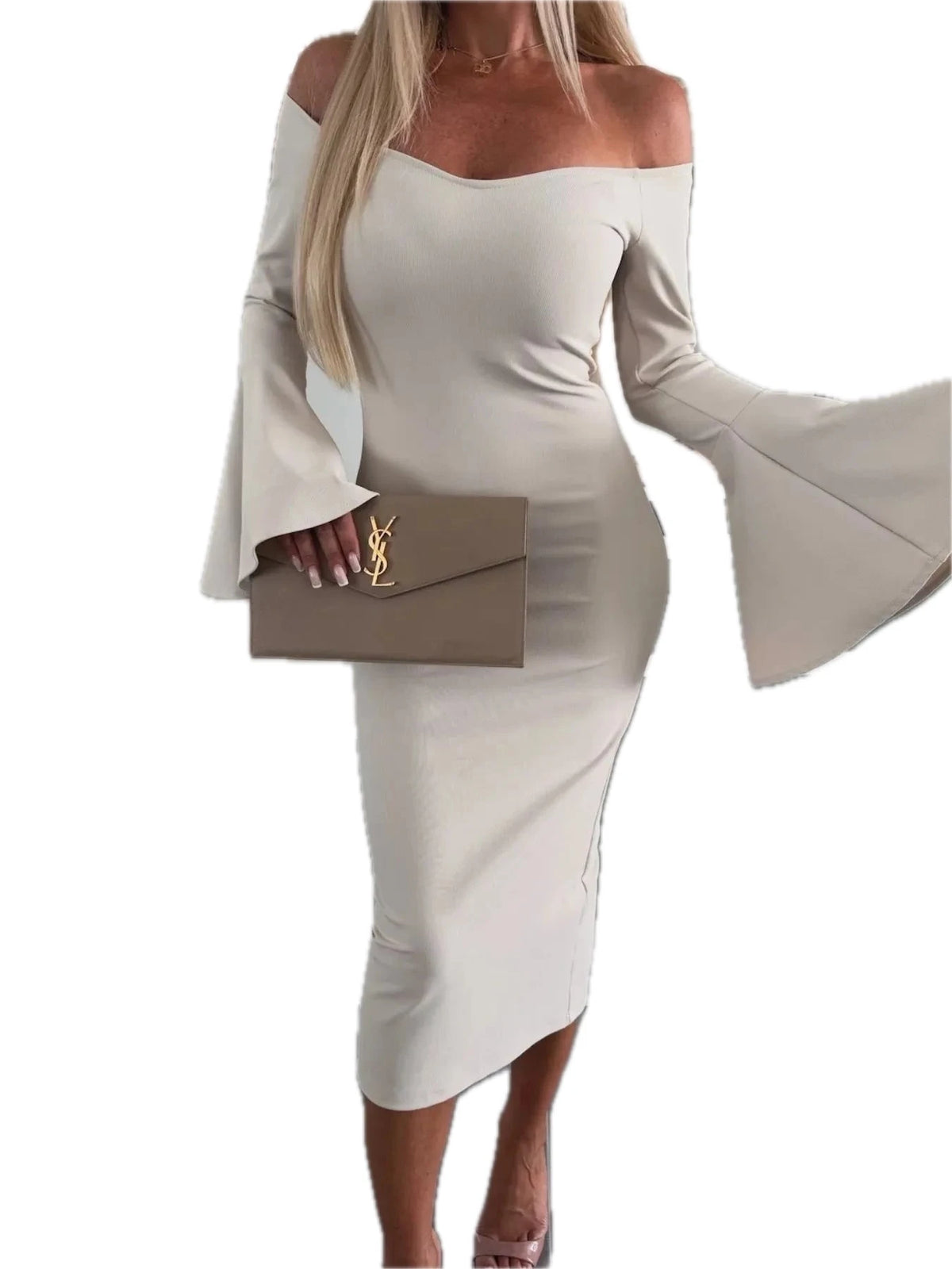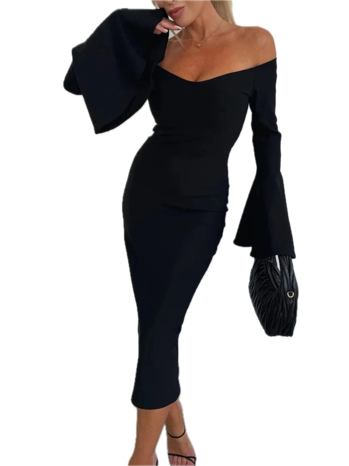Women's Off Shoulder Bell Sleeve Bodycon Midi Dress in 100% Polyester Fabric with Stretch and Slit for Evening Party
