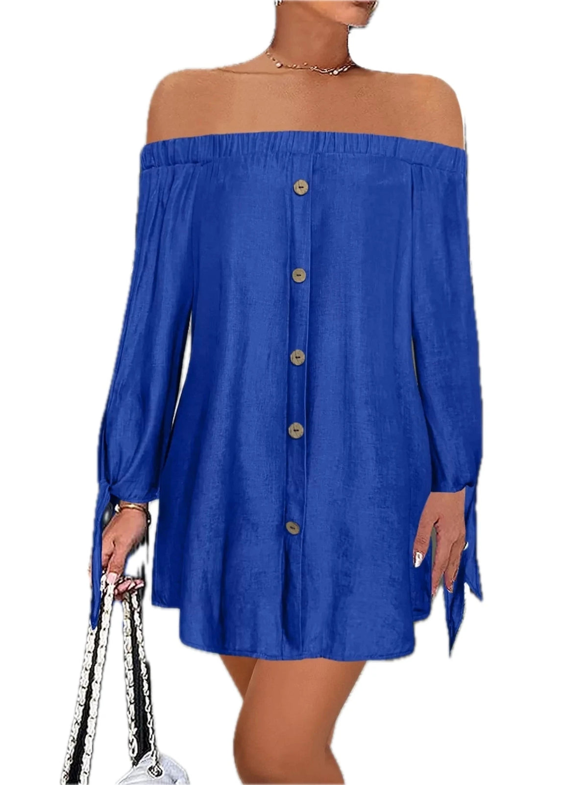 Women's Off Shoulder Casual Mini Dress with Tied Front Details Ninety five percent polyester five percent spandex