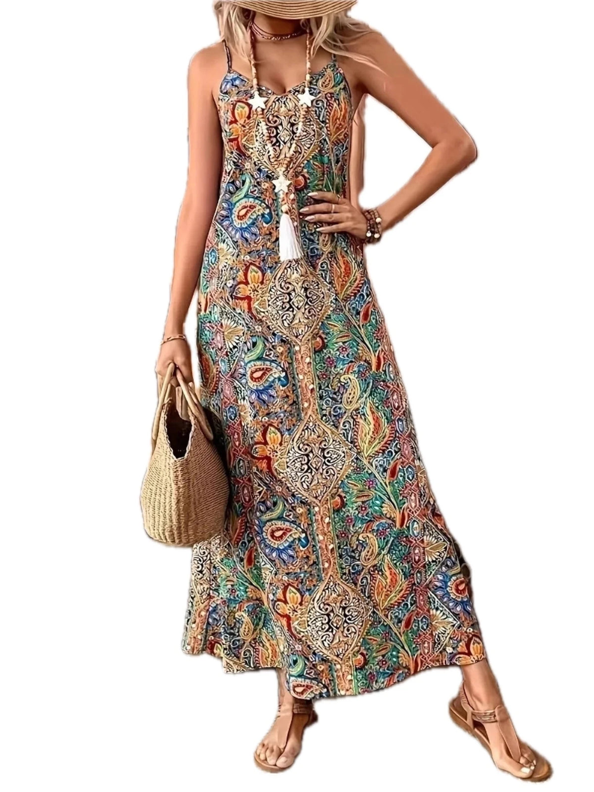 Women's Paisley Print V Neck Maxi Dress Ninety five percent polyester and five percent spandex for elegant flow