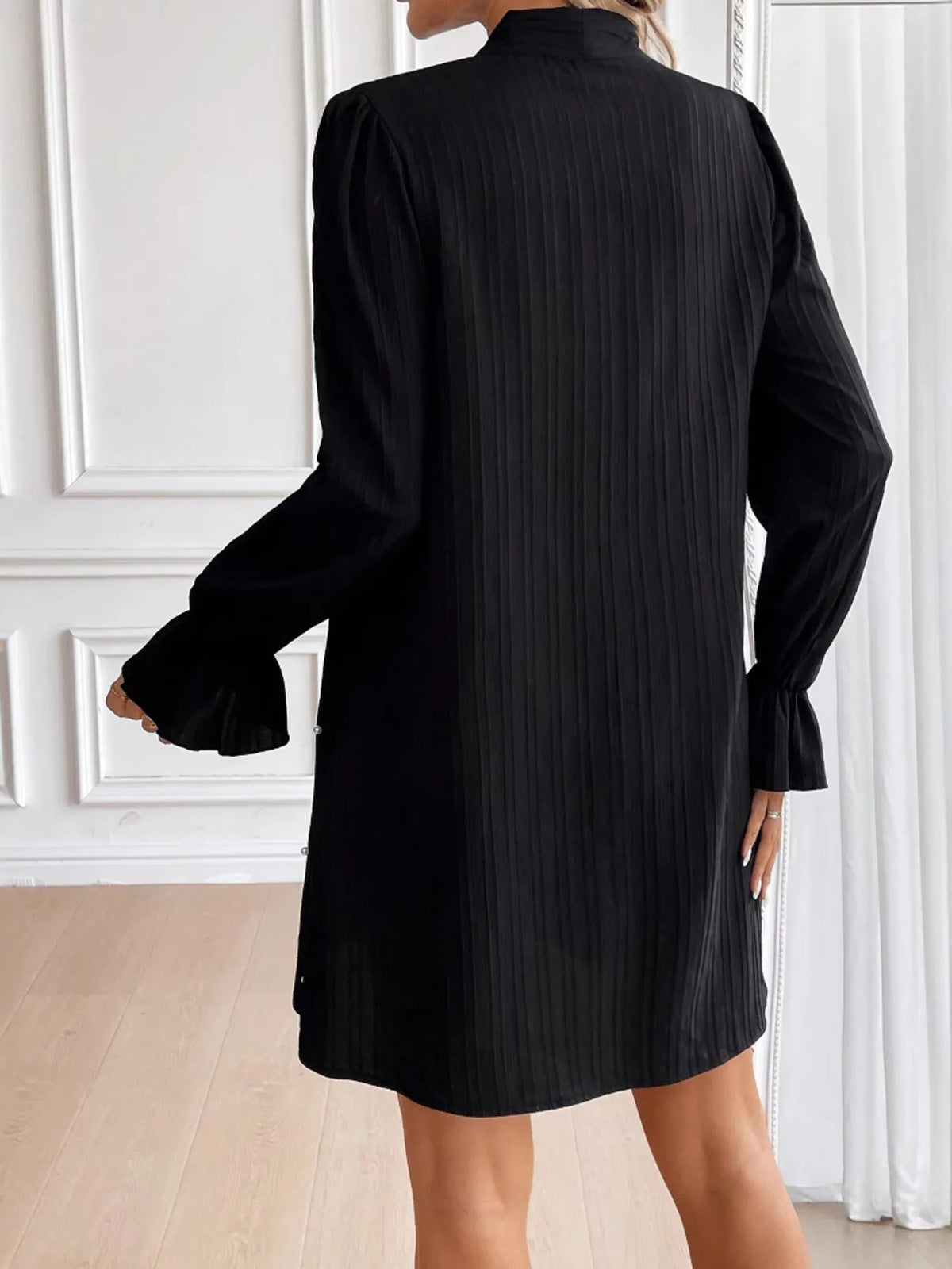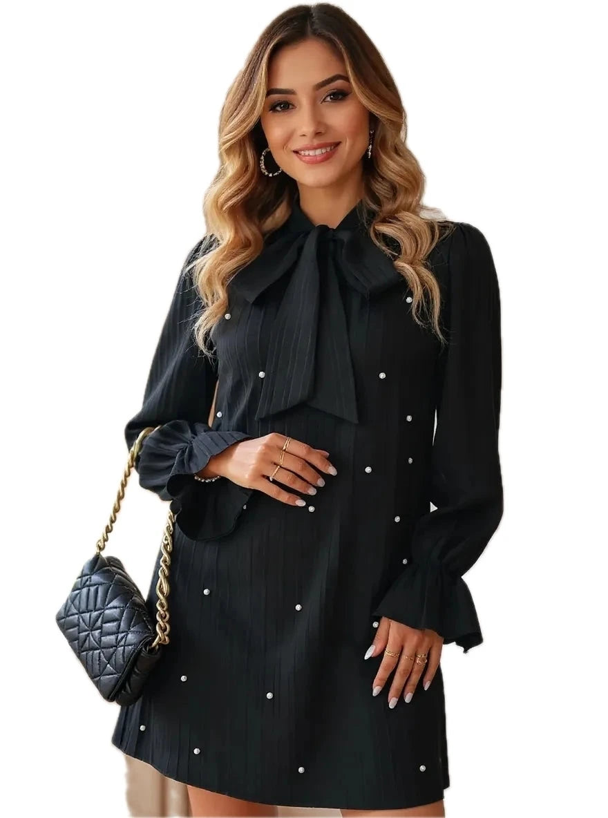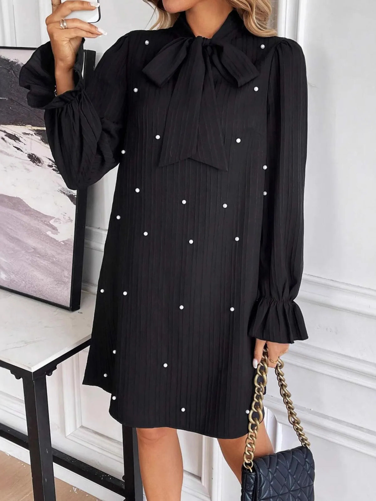 Women's Pearl Embellished Bow Tie Flounce Sleeve Dress with Ruffle Details and Elegant Silhouette polyester 100%