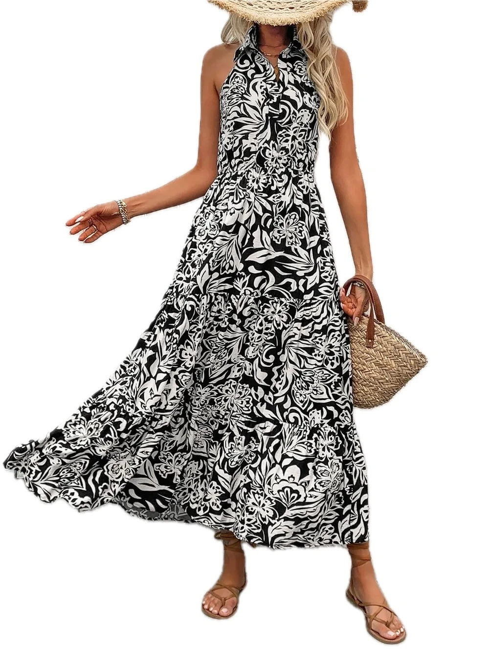 Women's Backless Smocked Printed Sleeveless Midi Dress 100% Polyester Lightweight Flowy Design for Events and Everyday
