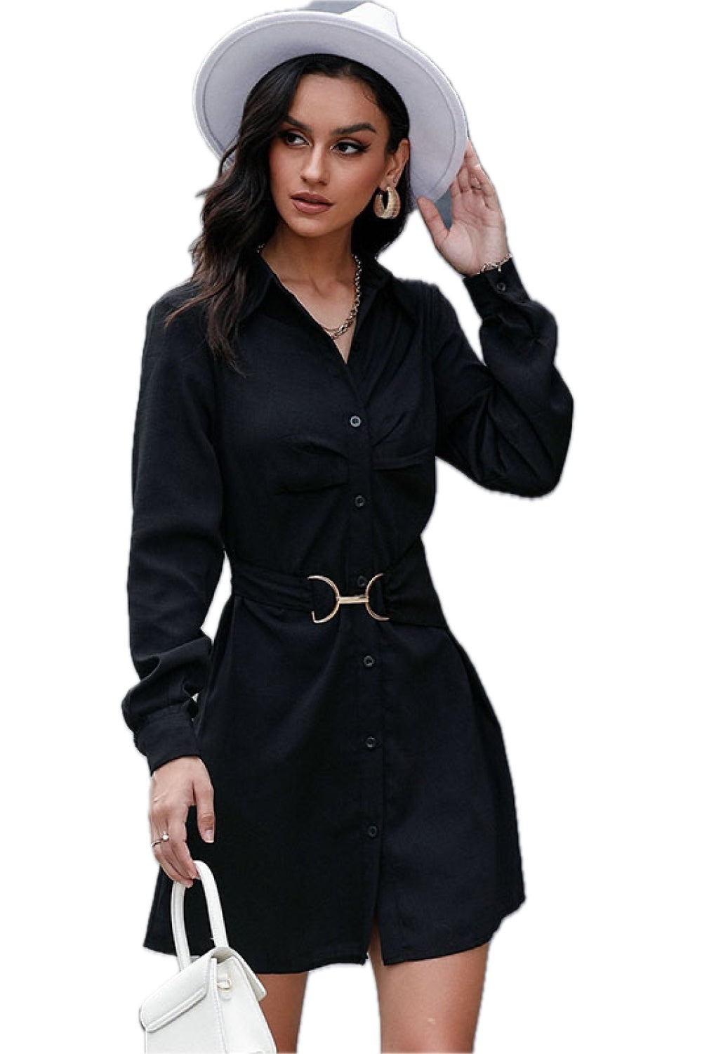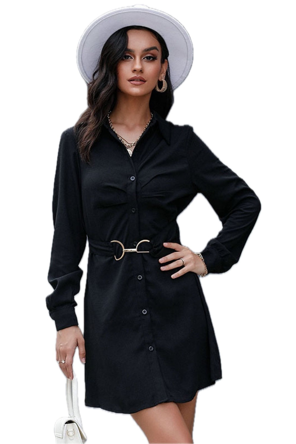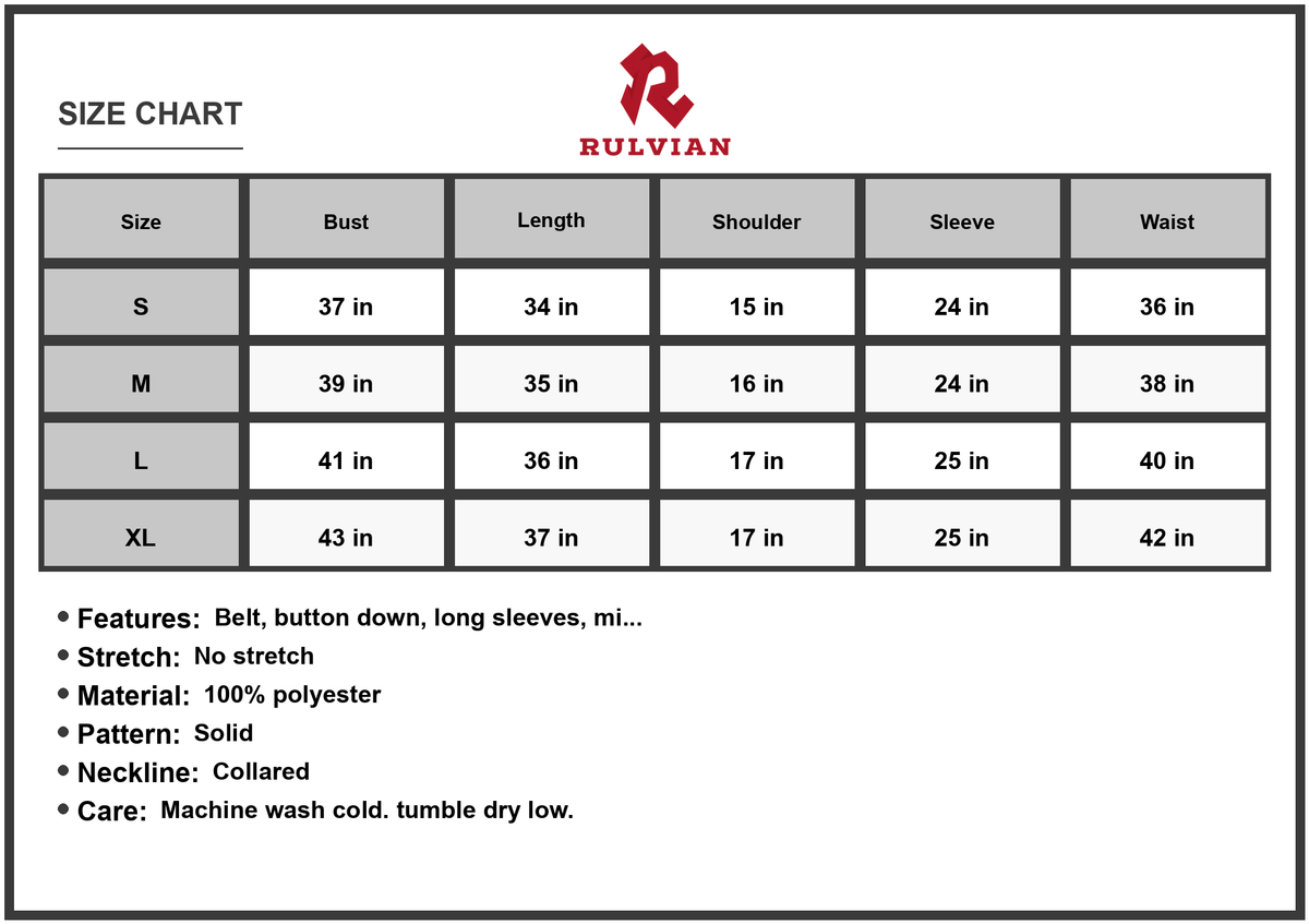 • Features: Belt, button down, long sleeves, mini