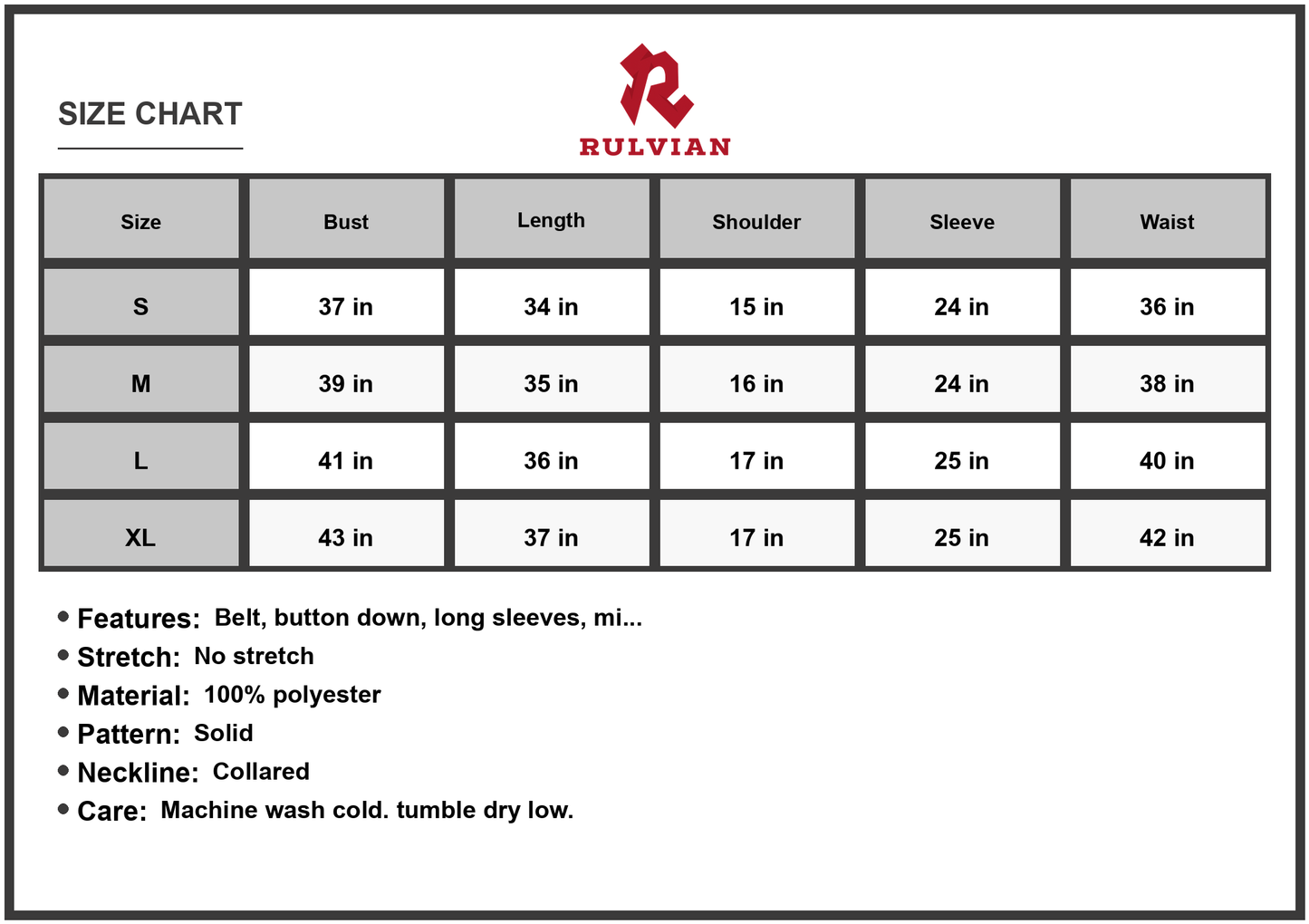 S: bust 37 in, length 34 in, sleeve 24 in, shoulder 15 in, waist 36 in