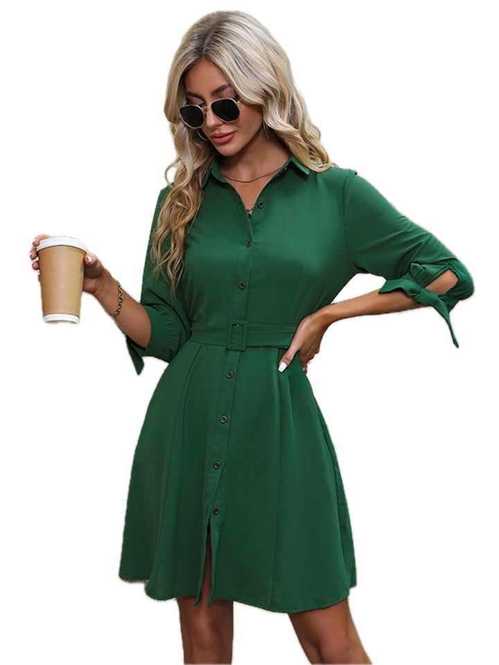 Women's Collared Neck Button Up Three Quarter Sleeve Dress Belted A line Mini Silhouette Polyester 100% Everyday Wear