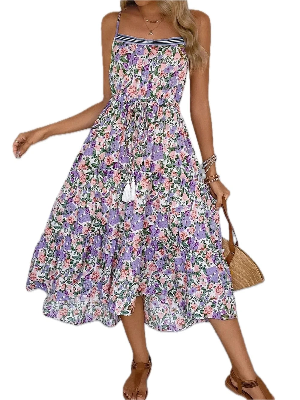 Women's Sleeveless Button Decor Printed Tiered Midi Dress with Ruched Sheer Overlay 100% Polyester Fabric for daily wear