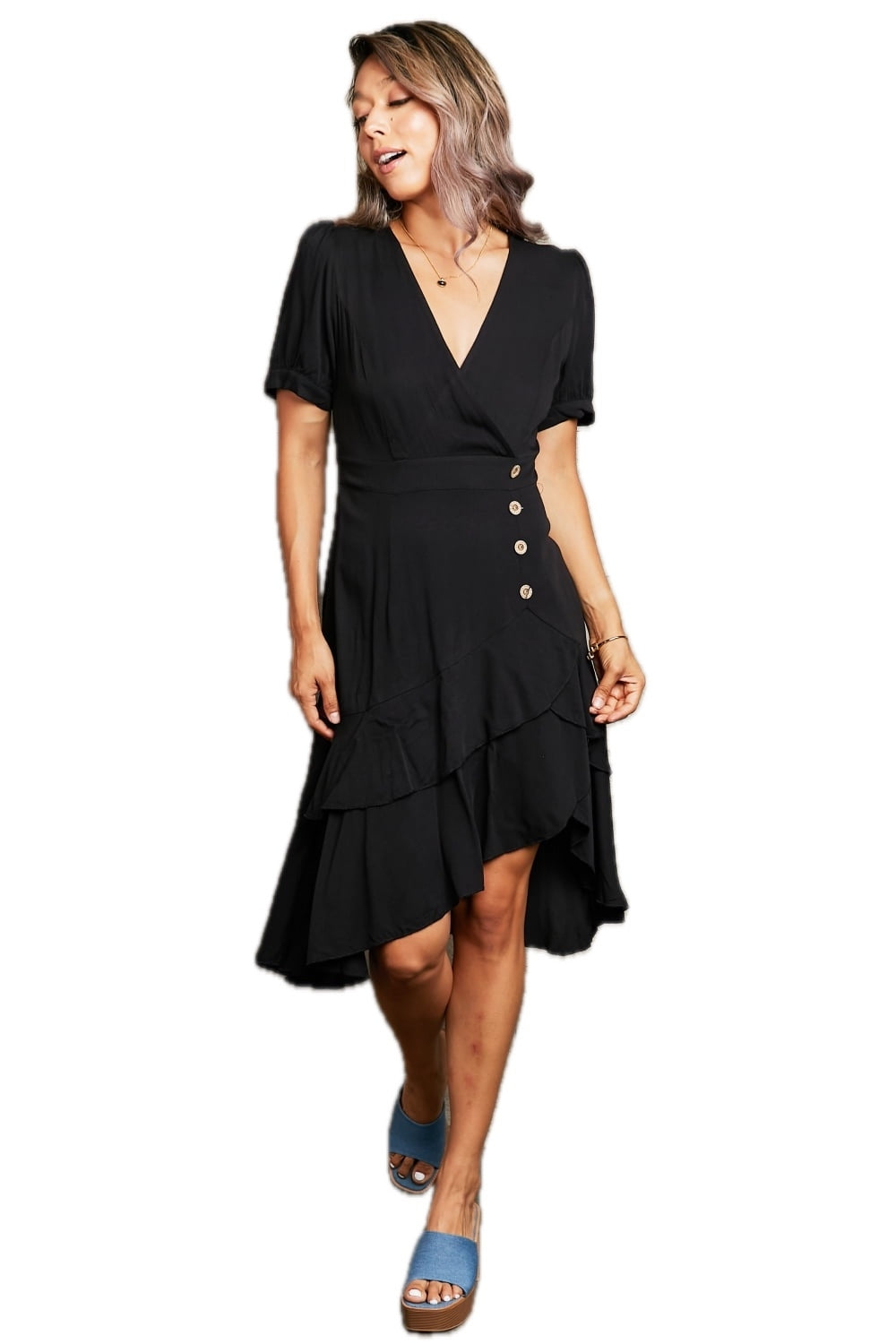 Women's Dress with Decorative Button Surplice and Ruffle Hem V Neck Knee Length Short Sleeve 100% viscose Chic