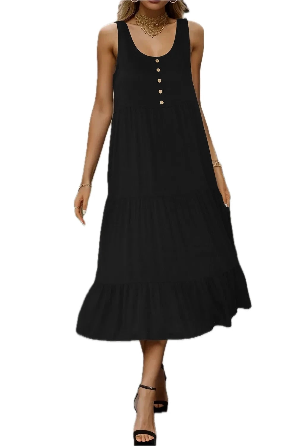 Women's Tiered Tank Dress with Decorative Buttons and Sheer Overlay featuring 100% Viscose Fabric for Comfortable