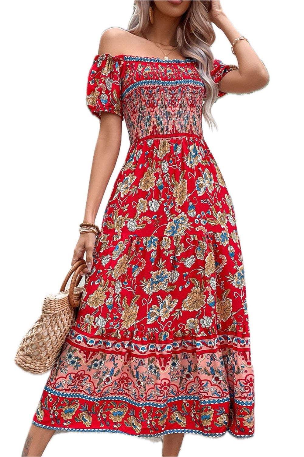Women's Floral Off Shoulder Smocked Midi Dress 100% viscose Lightweight Vacation Ready Feminine Everyday Dress