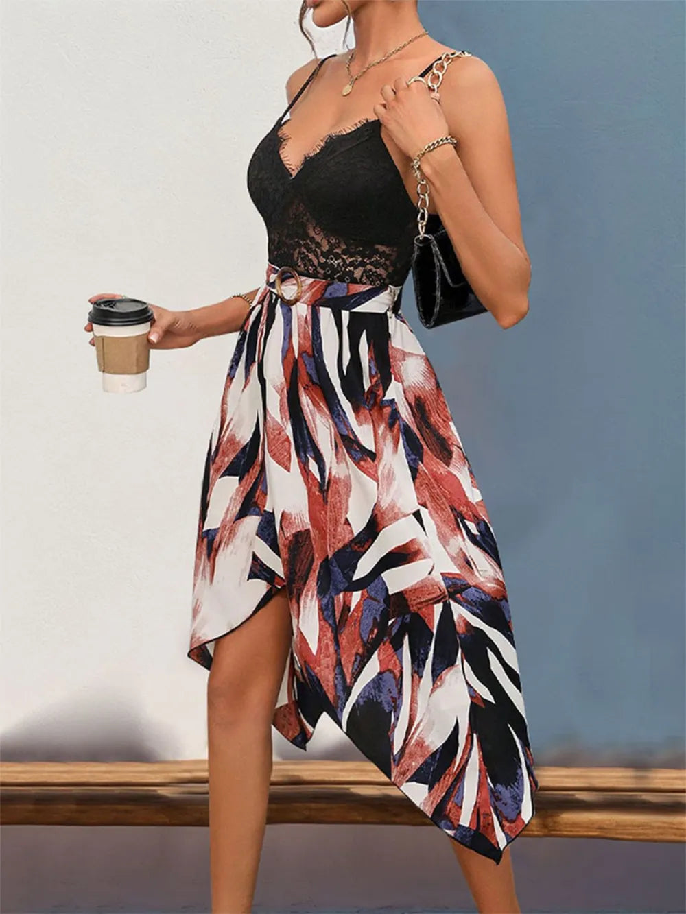 Women's Lace Patchwork Printed V Neck Dress Sheer Overlay 100% Polyester Fabric Elegant Party Ready Evening Wear