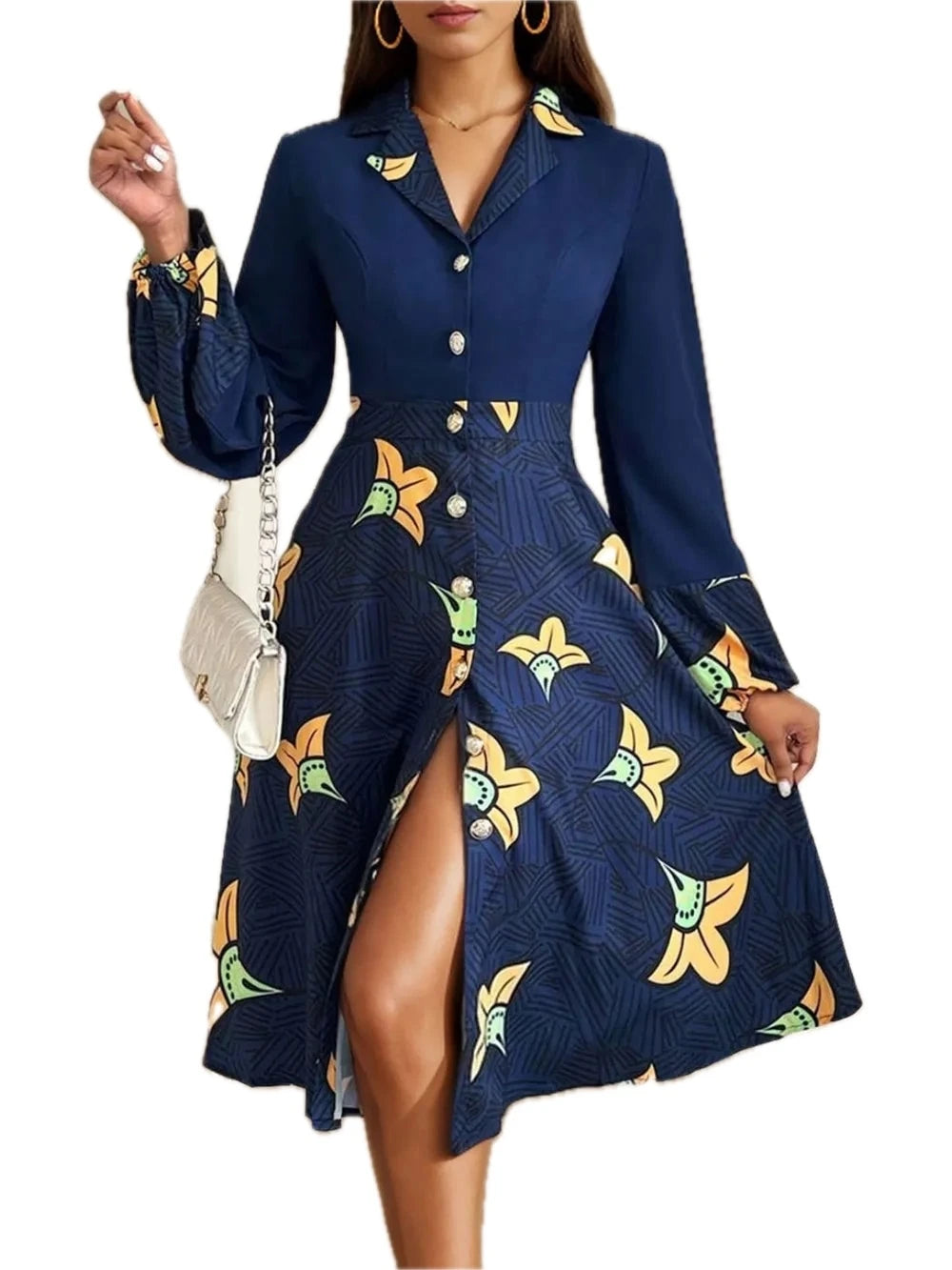 Women's Printed Collared Neck Long Sleeve Dress with Button Front Sheer Overlay 100% Polyester Easy Care Machine Wash