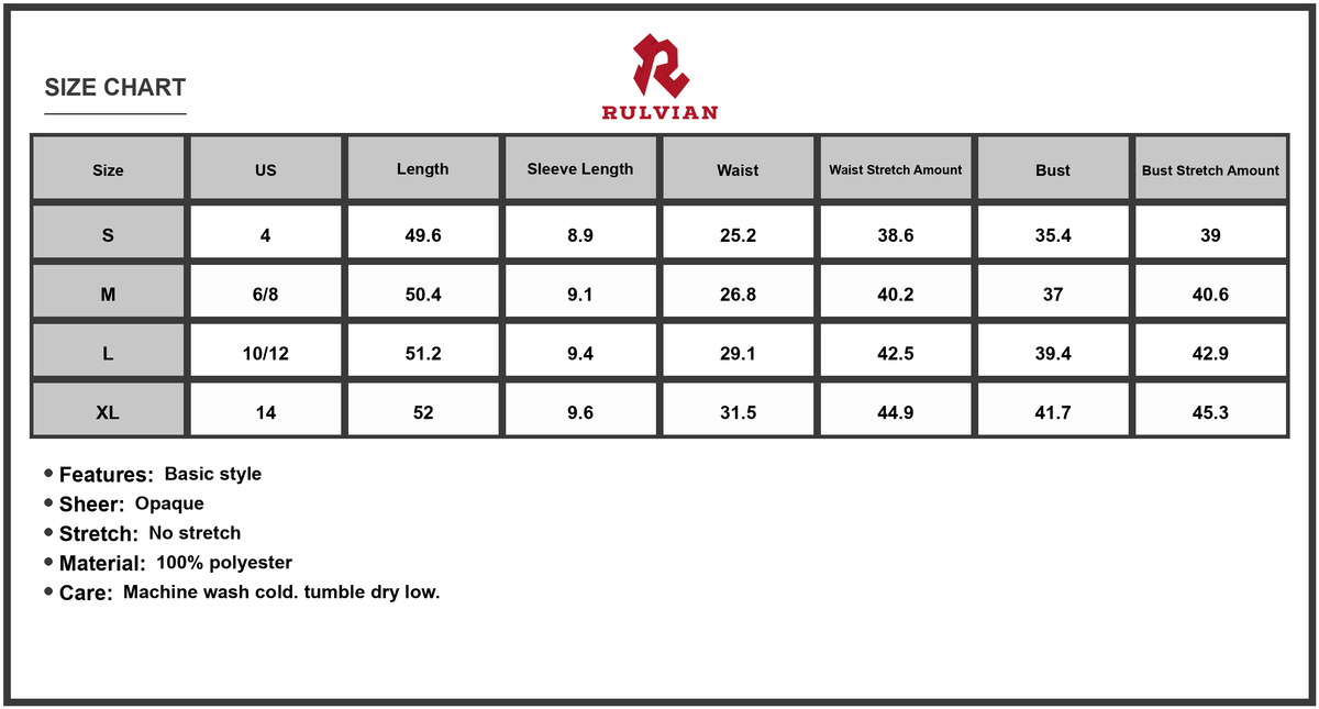 Size | US | Length | Sleeve Length | Waist | Waist Stretch Amount | Bust | Bust Stretch Amount |