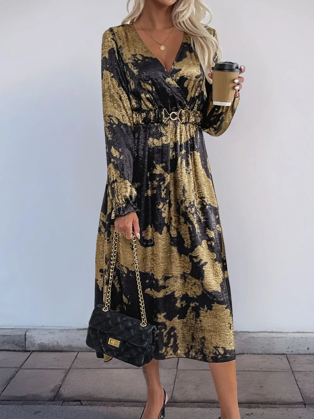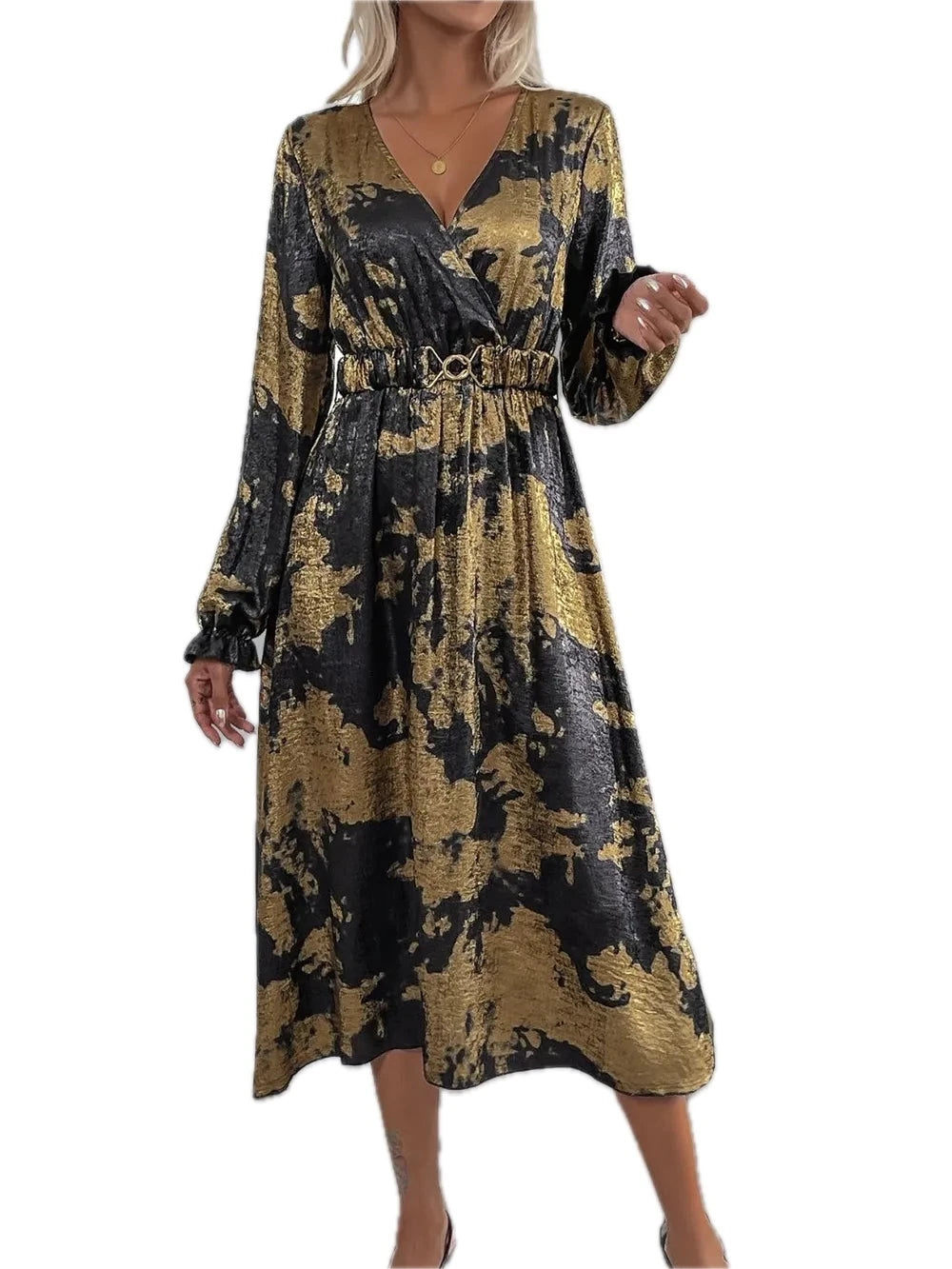 Women Printed Surplice Long Sleeve Midi Dress 100% Polyester Elegant Design for Everyday Wear Soft Comfortable Fit