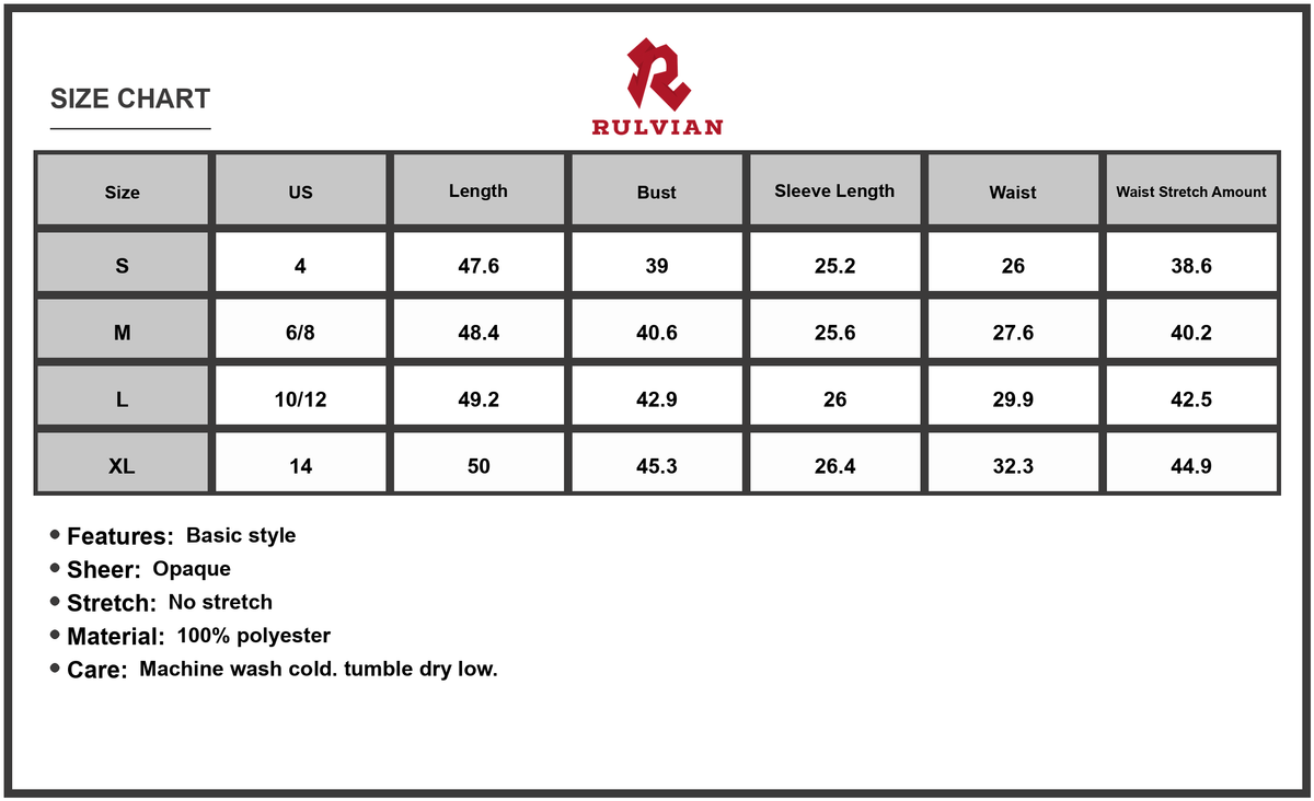 Size US Length Bust Sleeve Length Waist Waist Stretch Amount