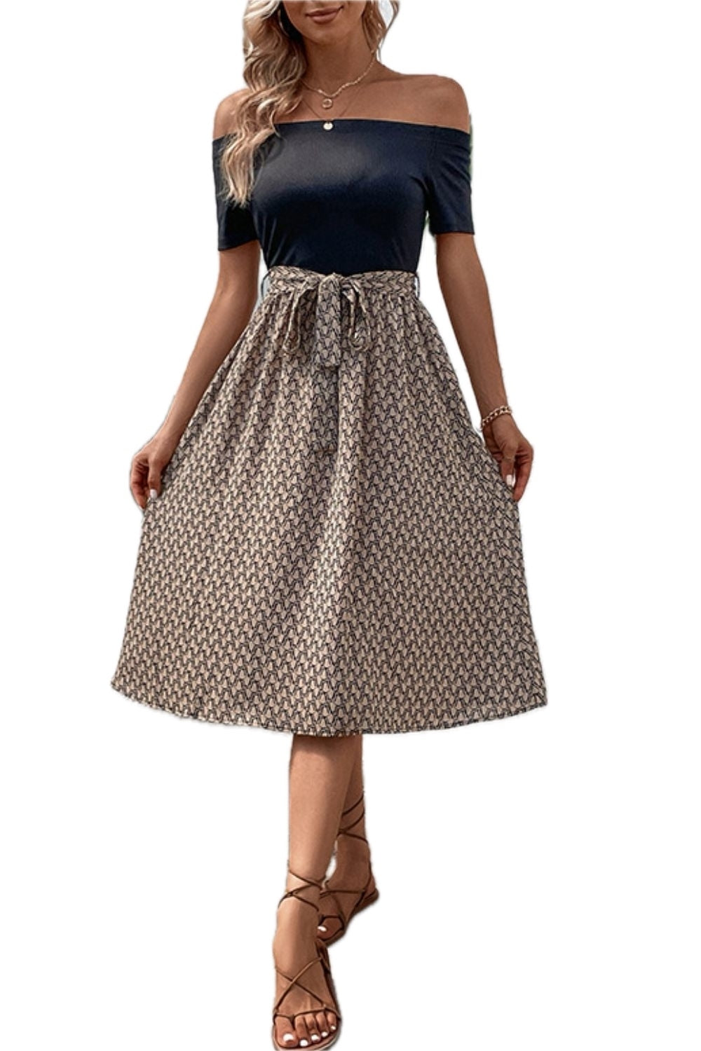 Women's Printed Tie Belt Off Shoulder Dress Knee Length with Short Sleeves Chic A Line Silhouette Polyester % Fabric