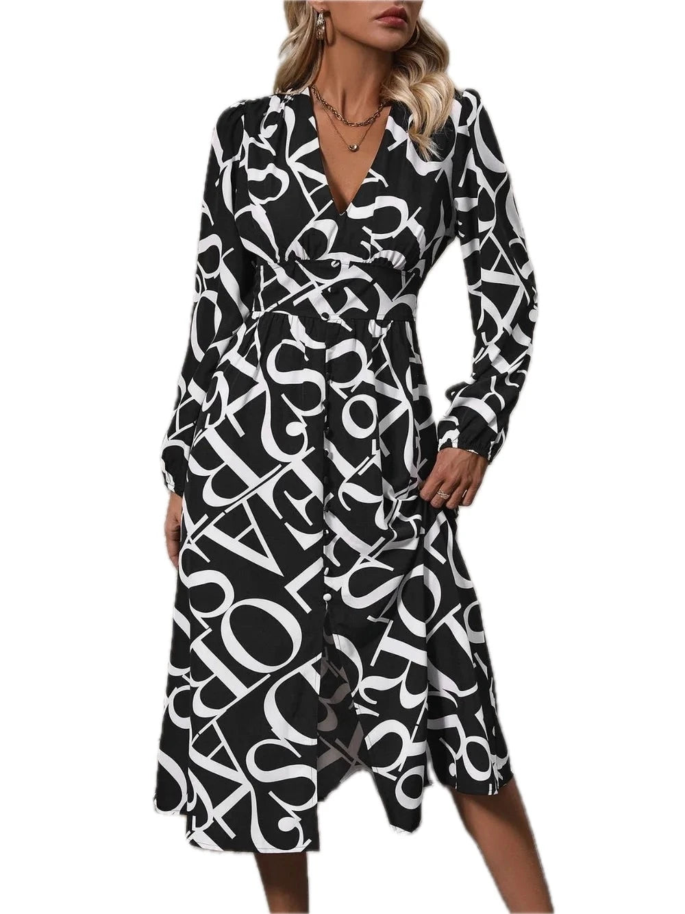 Women's Printed V Neck Long Sleeve Midi Dress with Subtle Buttoned Sheer Overlay and Polyester Soft Fabric 100%