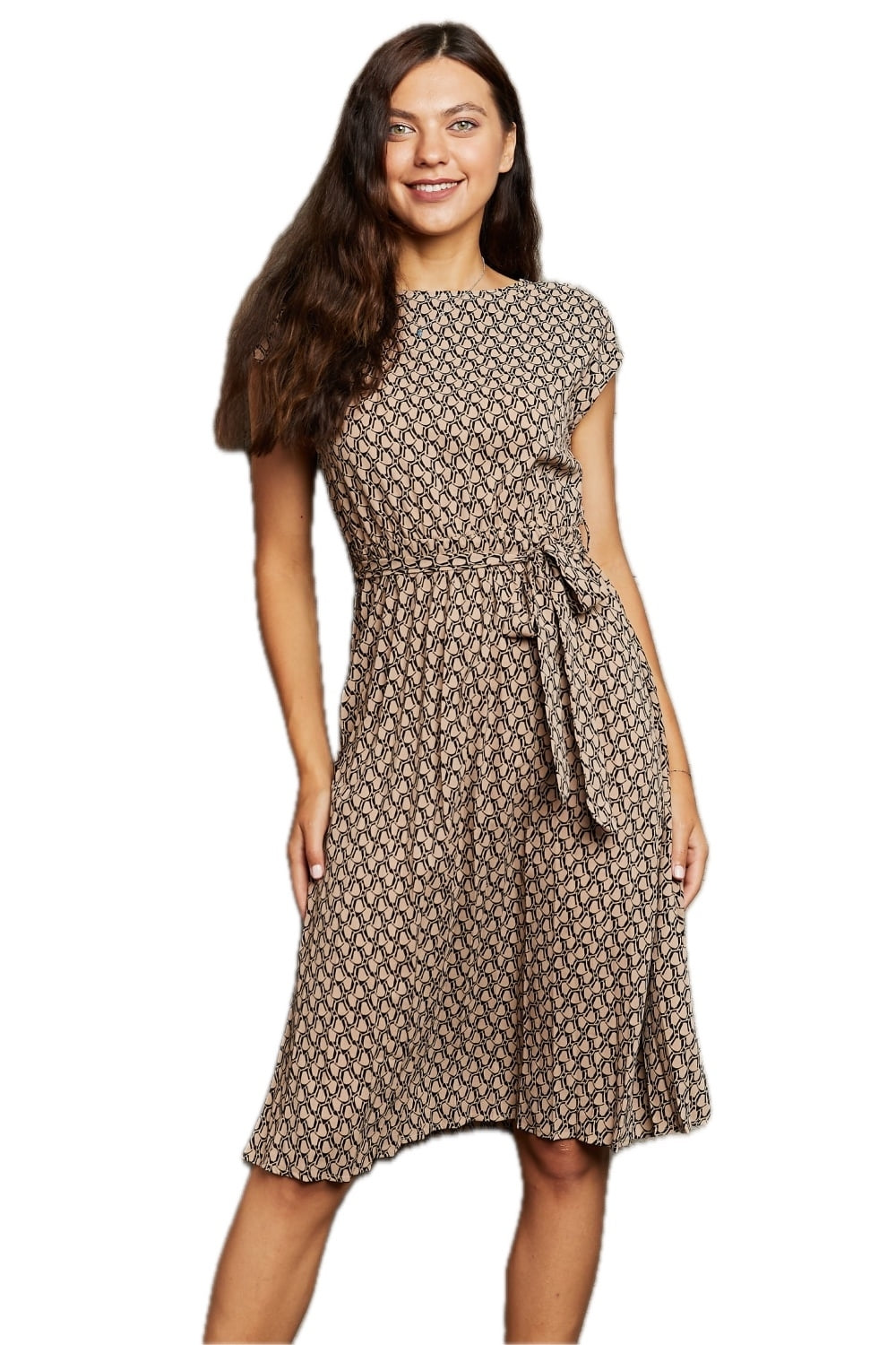 Women's Round Neck Belted Tie Waist A Line Knee Length Dress in 100% Polyester fabric with Short Sleeves Chic