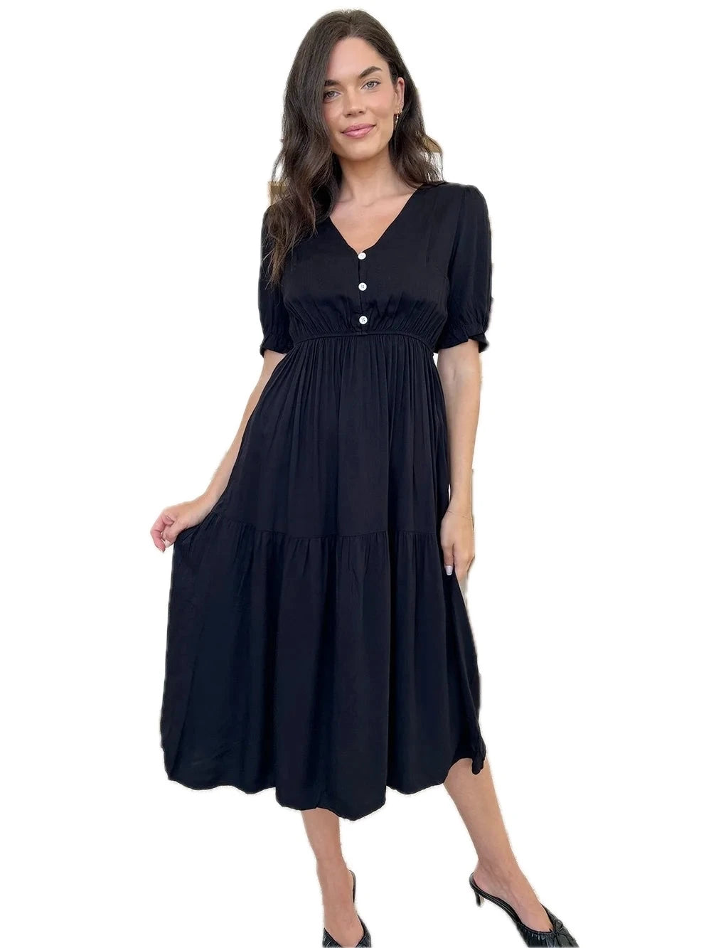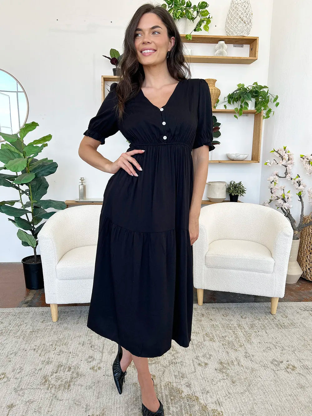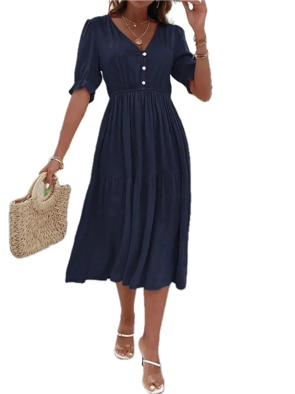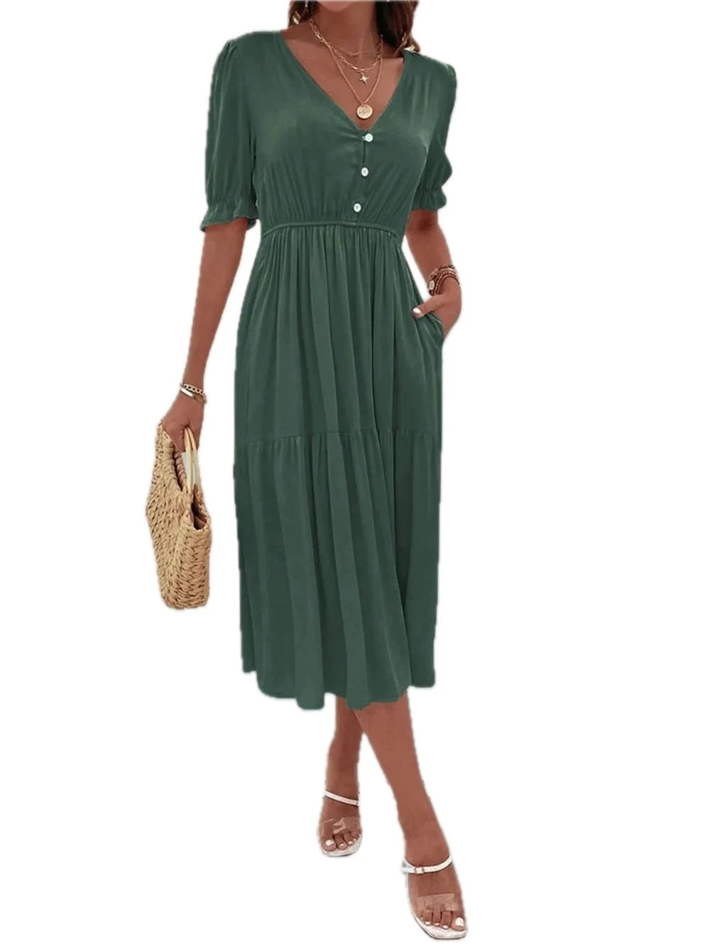 Women's Ruched V Neck Midi Dress with Half Sleeves and Ruffled Buttoned Details in Viscose 100% for Everyday Wear