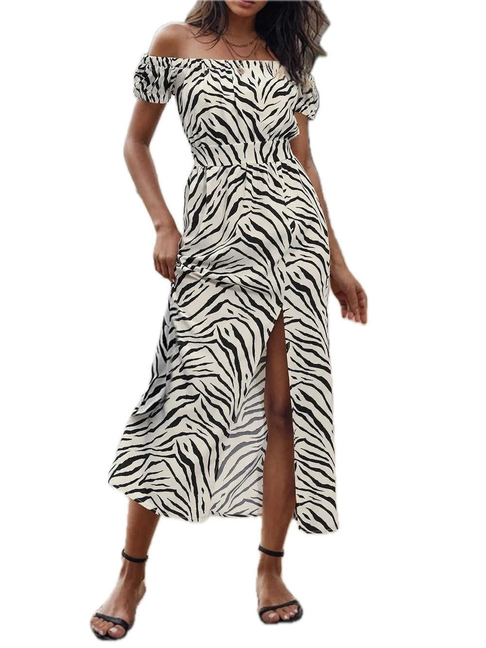 Women's Animal Print Slit Off Shoulder Midi Dress with Sheer Panels and Slight Stretch 100% Polyester Perfect for event