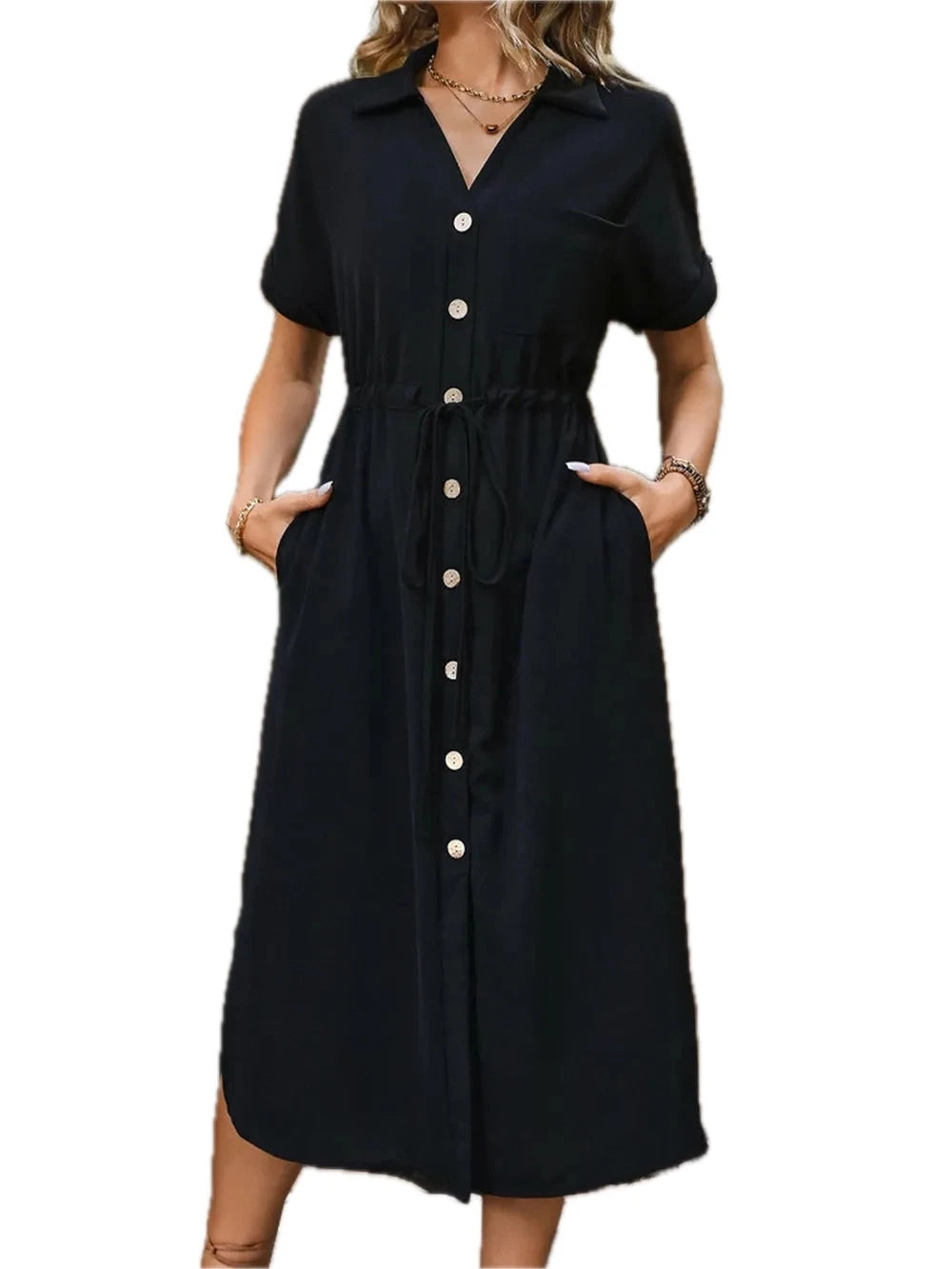 Women's Midi Dress with Slit Drawstring Front Button Up Short Sleeve Pocketed 100% Polyester Lightweight Everyday Wear