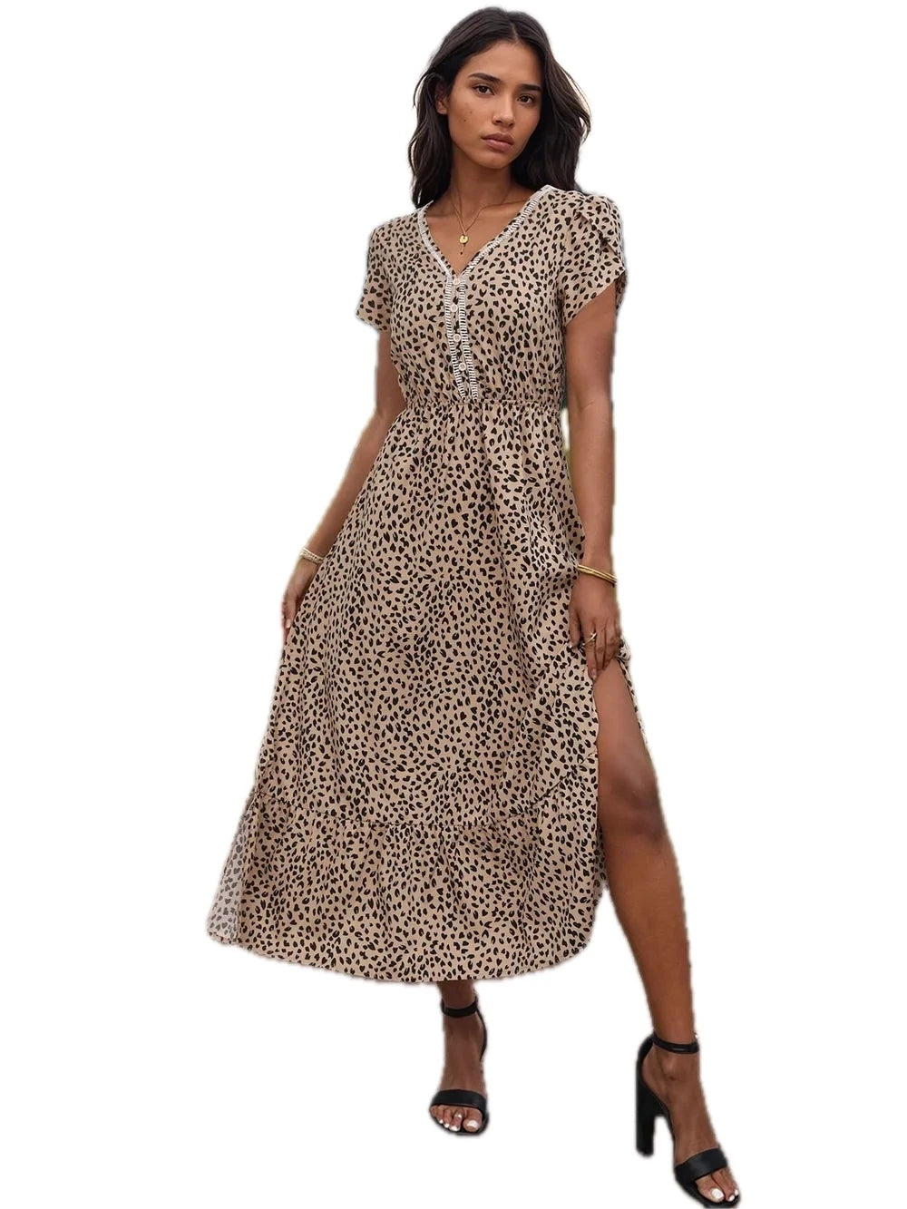 Women's Slit Printed V Neck Short Sleeve Dress 100% Polyester Fabric For Stylish Everyday Wear Beach Party Look