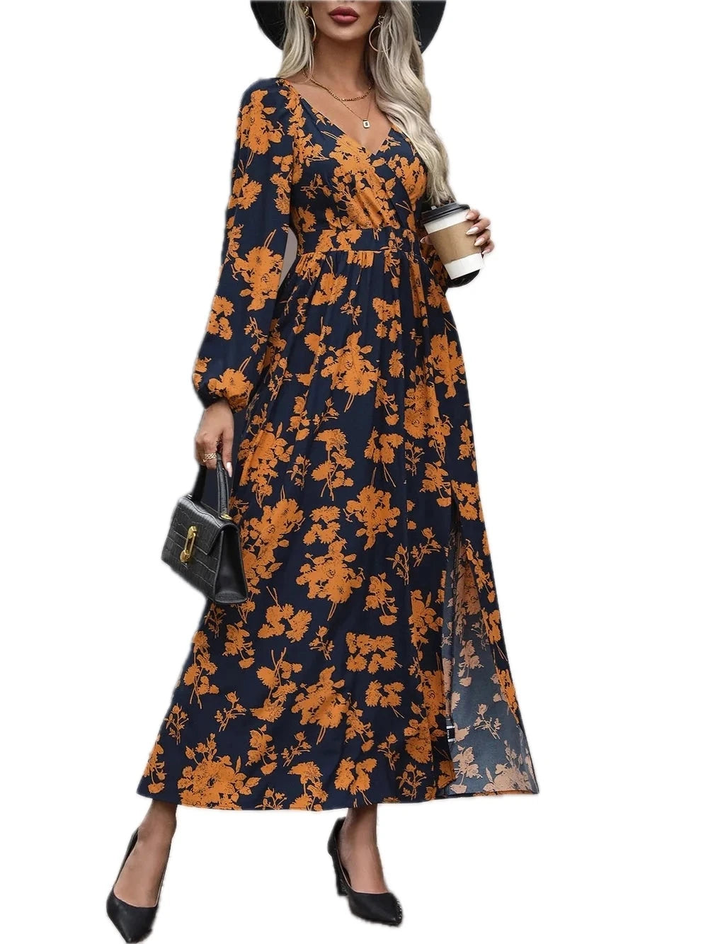 Women's Split Printed Surplice Long Sleeve Midi Dress 100% Polyester with Sheer Panels and Flattering Fit for Daily Wear