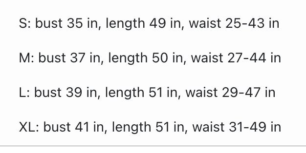 XL: bust 41 in, length 51 in, waist 31-49 in