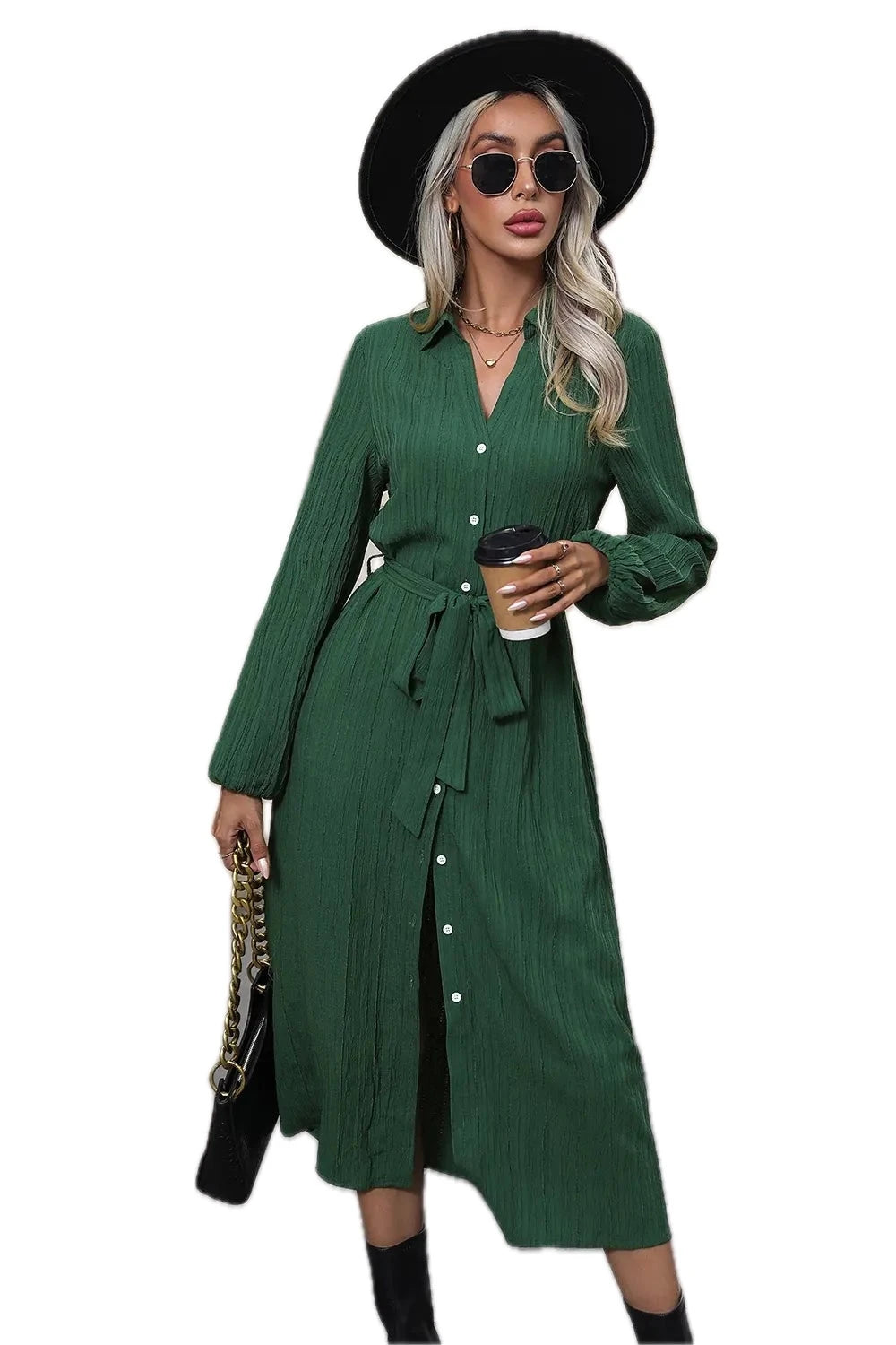 Women's Textured Tied Collared Neck Button Front Dress with Sheer Detail and Fabric 100% Polyester for daily wear