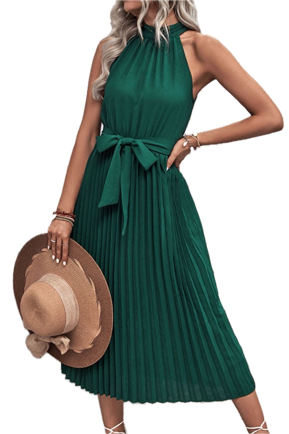 Women's Tie Belt Pleated Midi Dress with Grecian Neckline Sleeveless Classy Solid A line Silhouette 100% Polyester