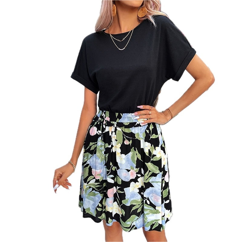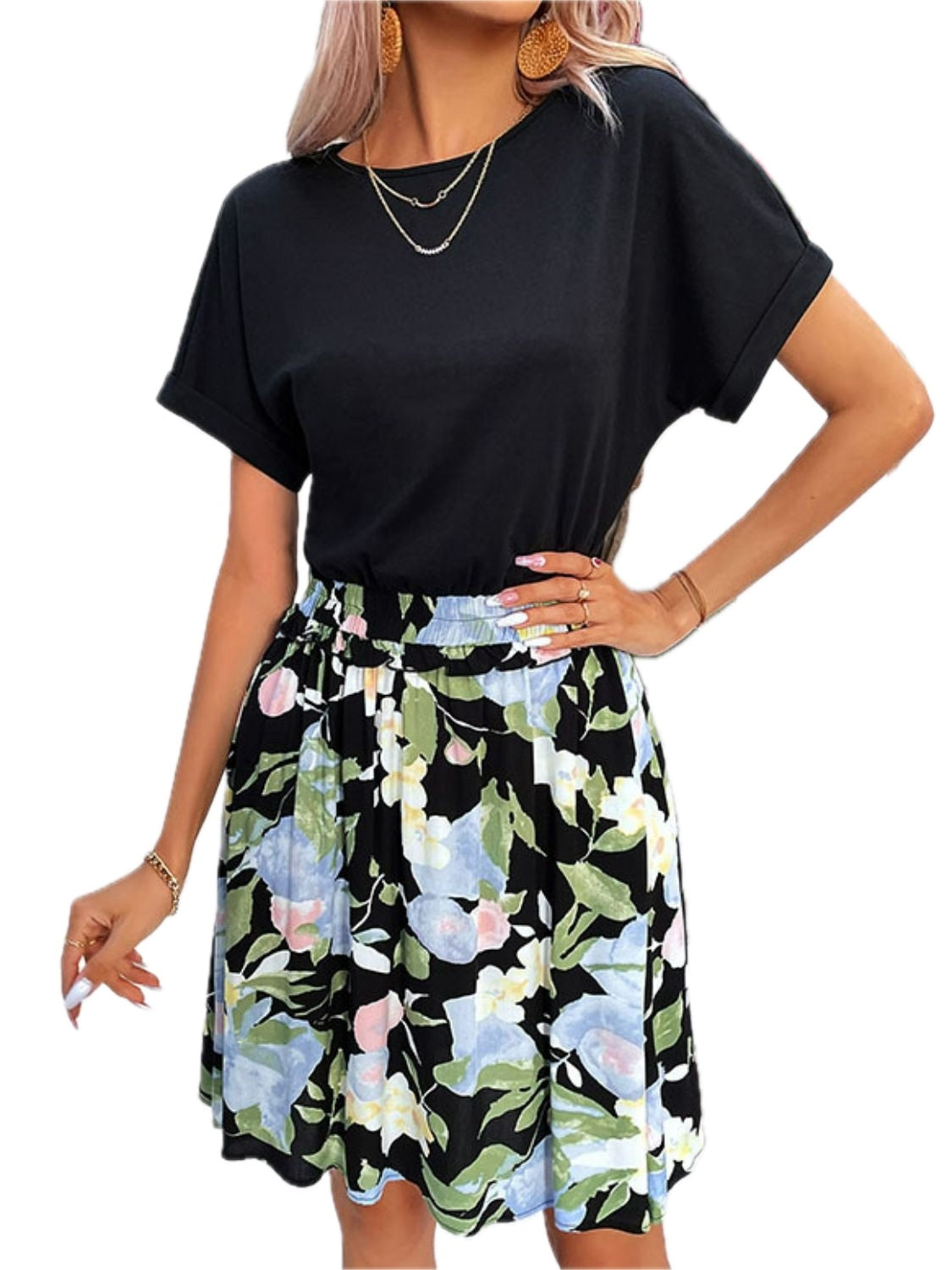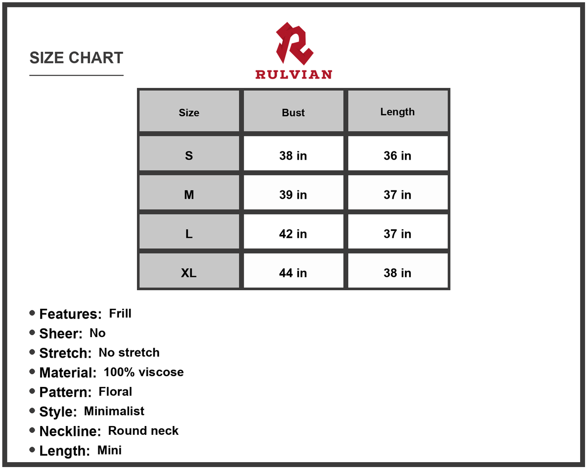 Women's Floral Two Tone Round Neck Cuffed Sleeve Mini Dress with Frill Neckline 100% viscose fabric for everyday wear