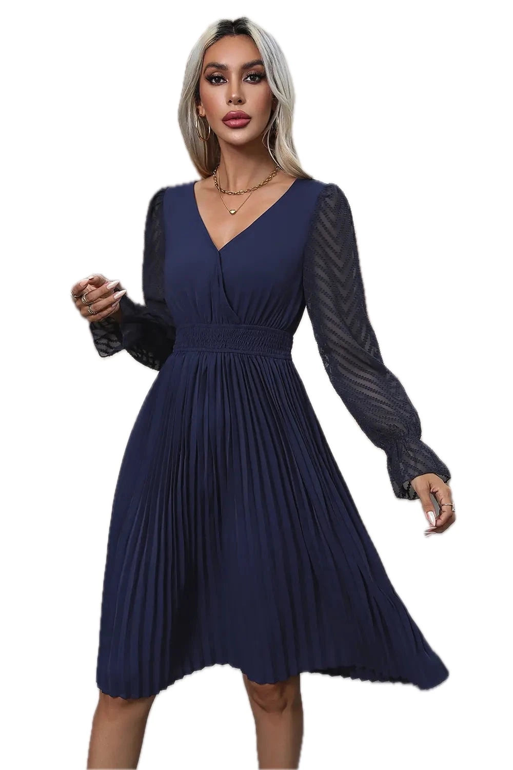 Women's V Neck Flounce Sleeve Pleated Dress with Semi Sheer Overlay for Everyday Wear Midi Length 100% Polyester