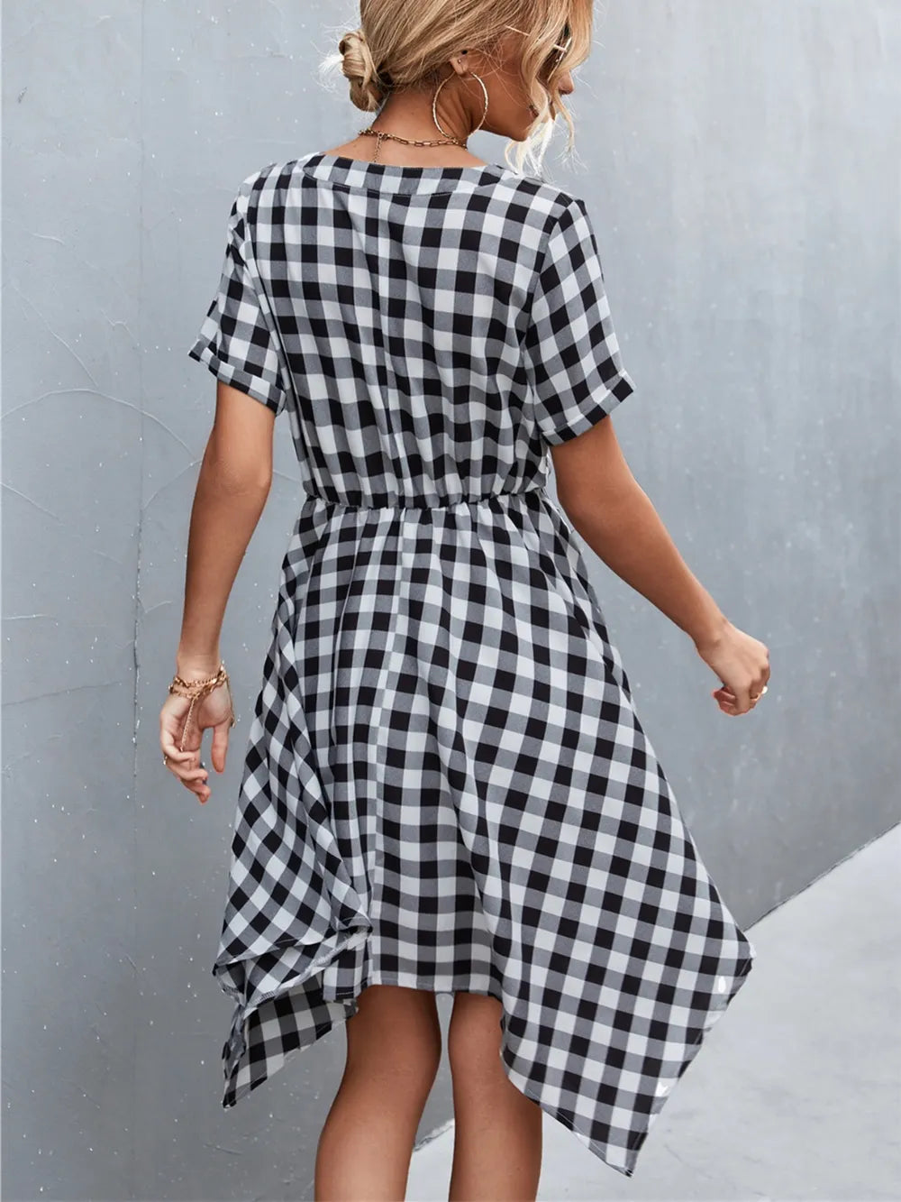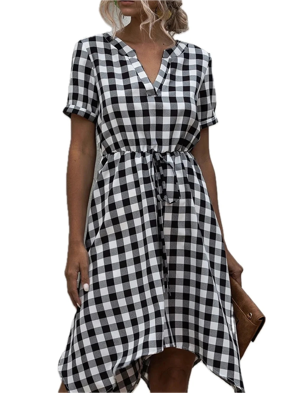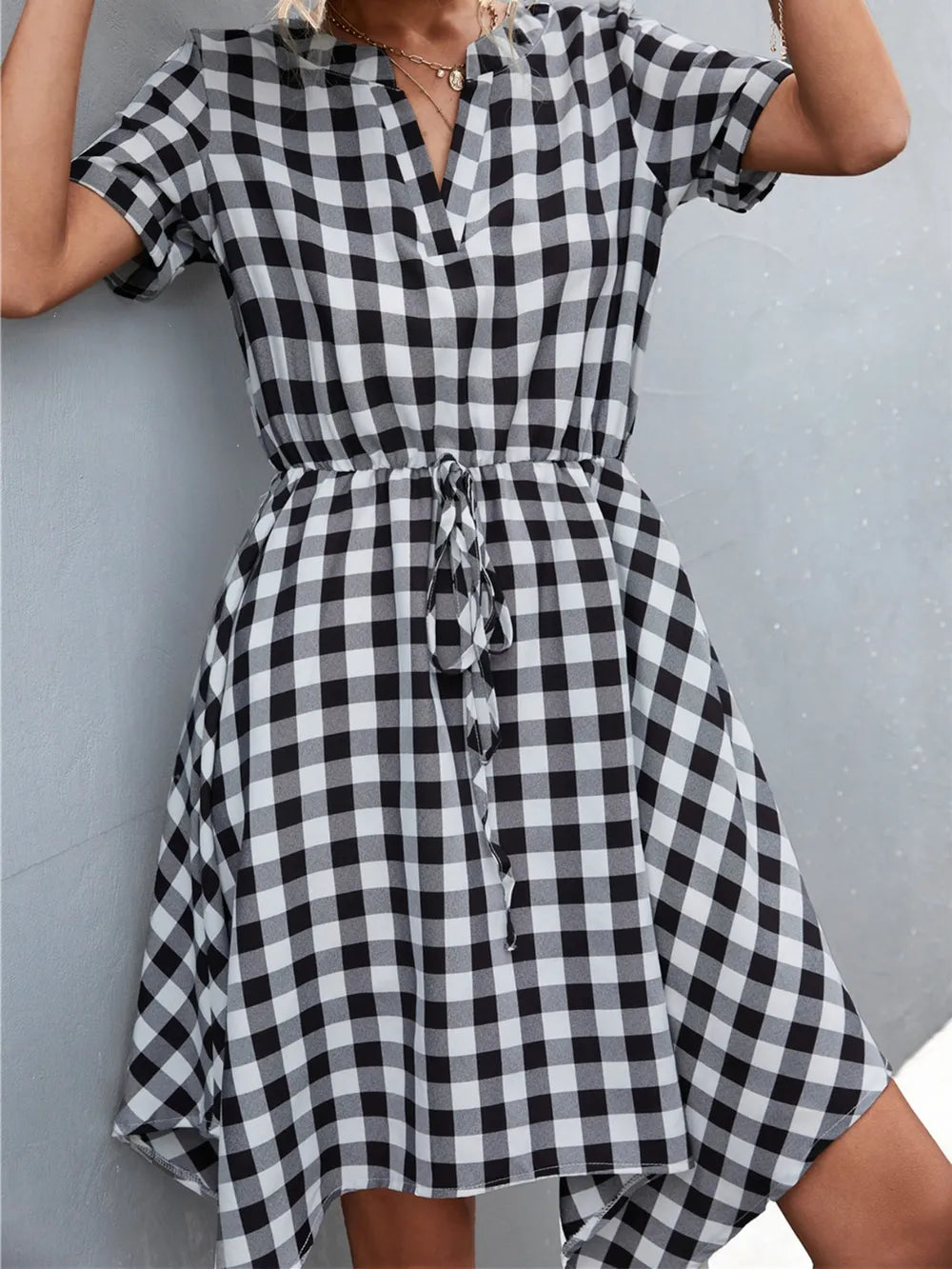 Women's Plaid Notched Short Sleeve Dress With Tied Front Detail Ninety Five Percent Polyester And Five Percent Spandex