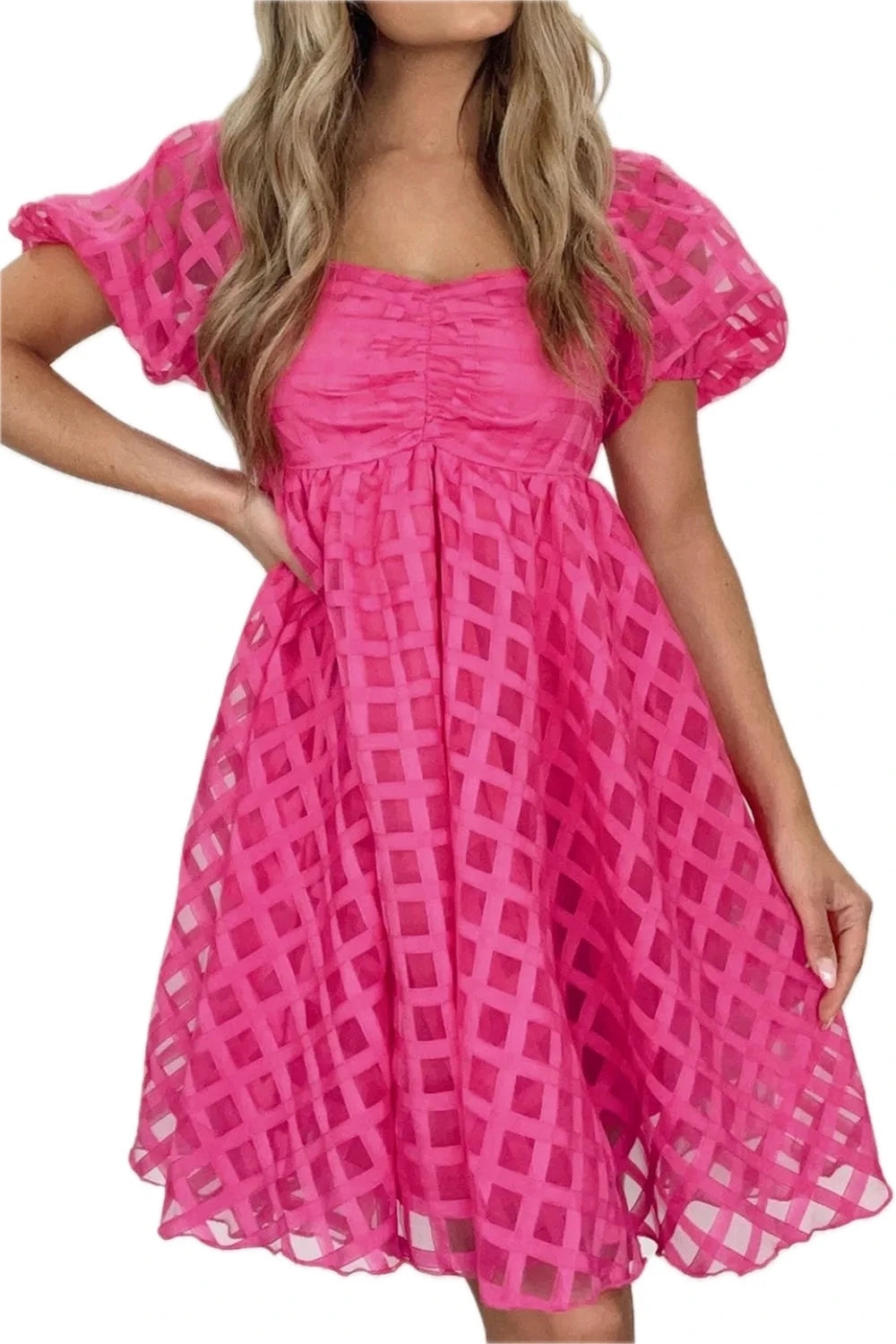 Womens Plaid Puff Sleeve Babydoll Dress with Sheer Top and Lined Skirt Polyester Fabric Clothing For All Seasons