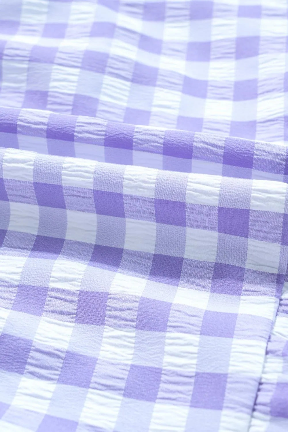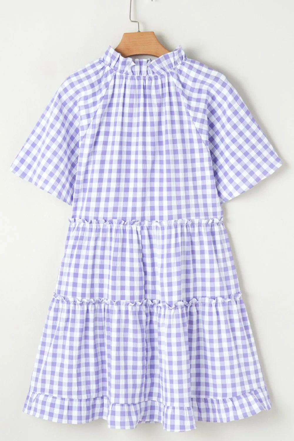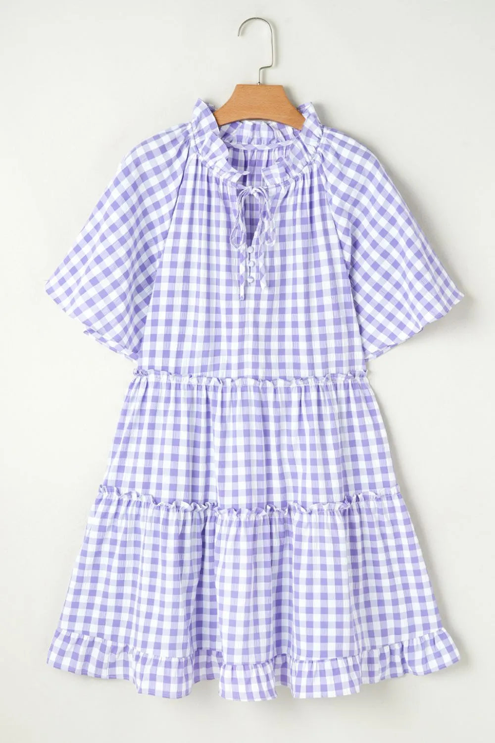 Women's Plaid Tie Neck Short Sleeve Babydoll Mini Dress with 95% polyester 5% elastane fabric for a flirty playful look