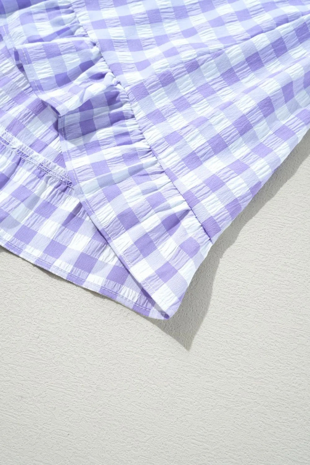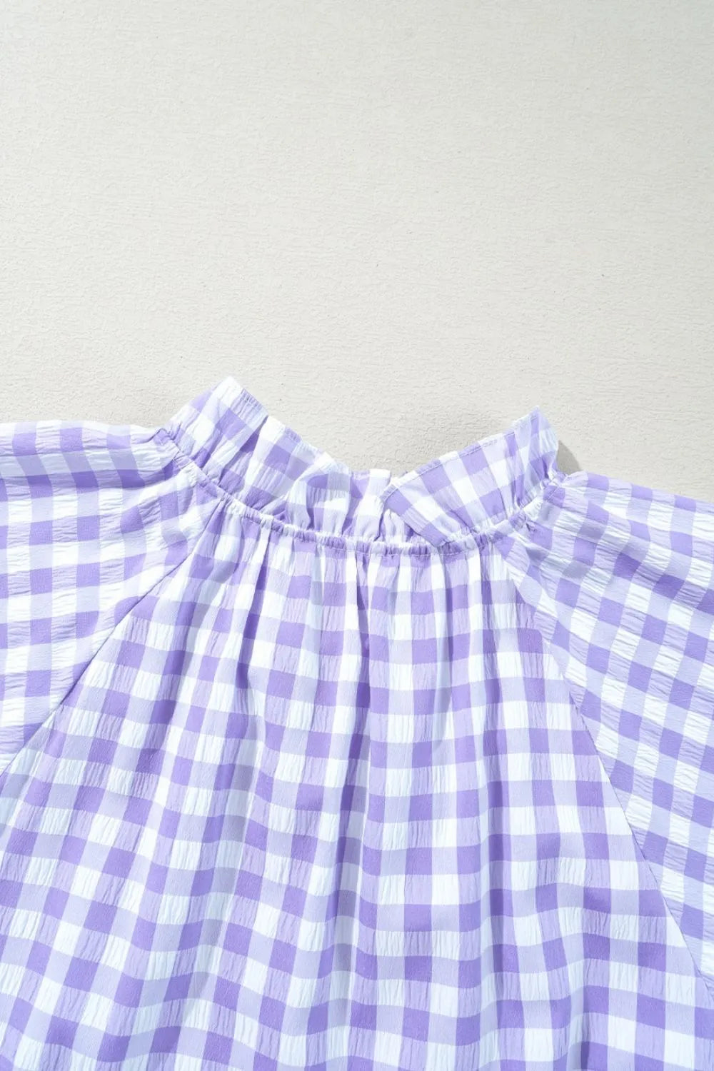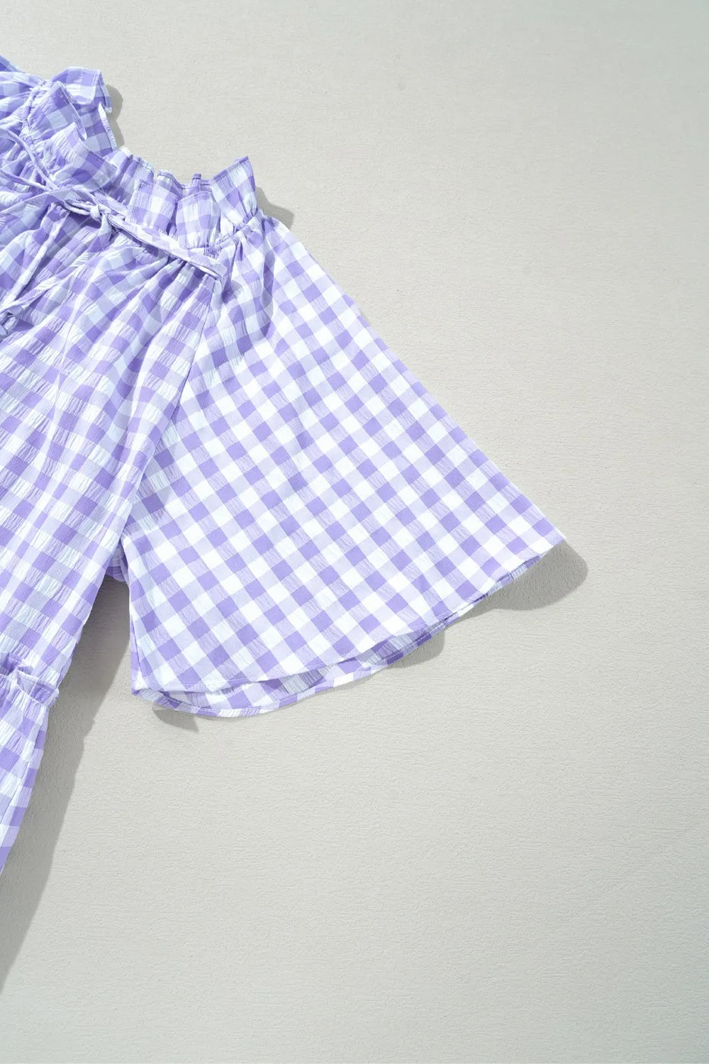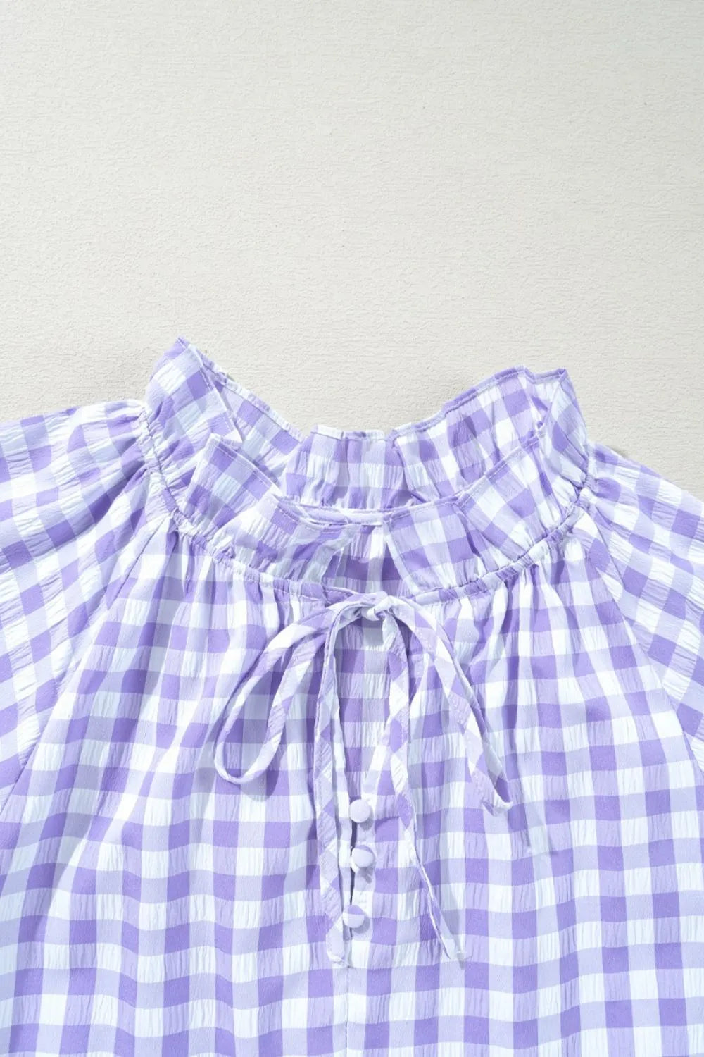 Women's Plaid Tie Neck Short Sleeve Babydoll Mini Dress with 95% polyester 5% elastane fabric for a flirty playful look