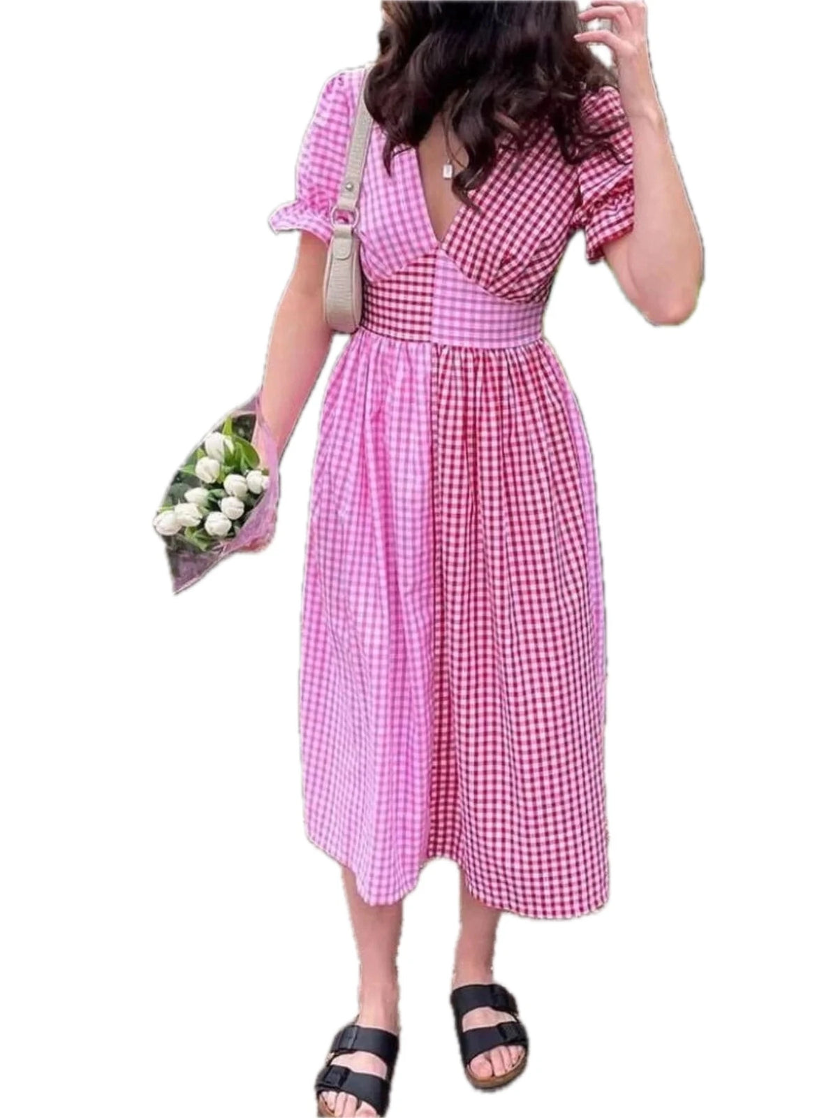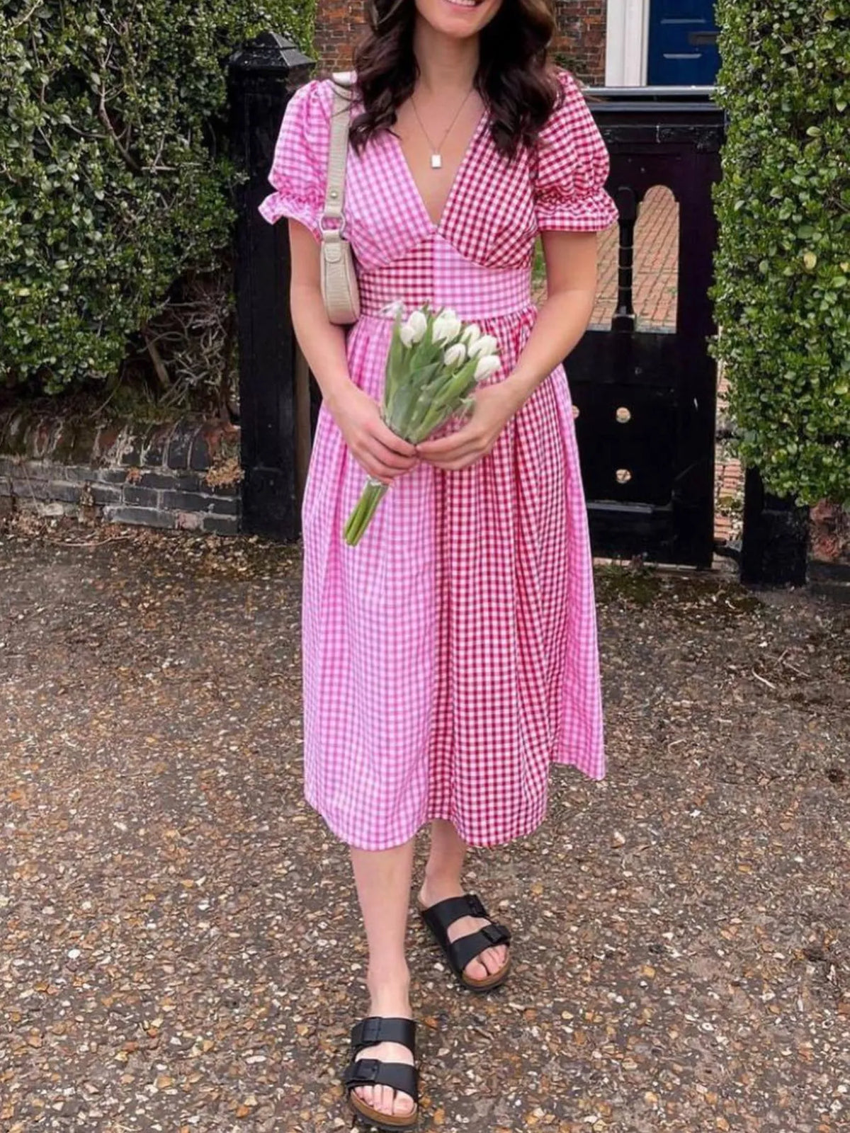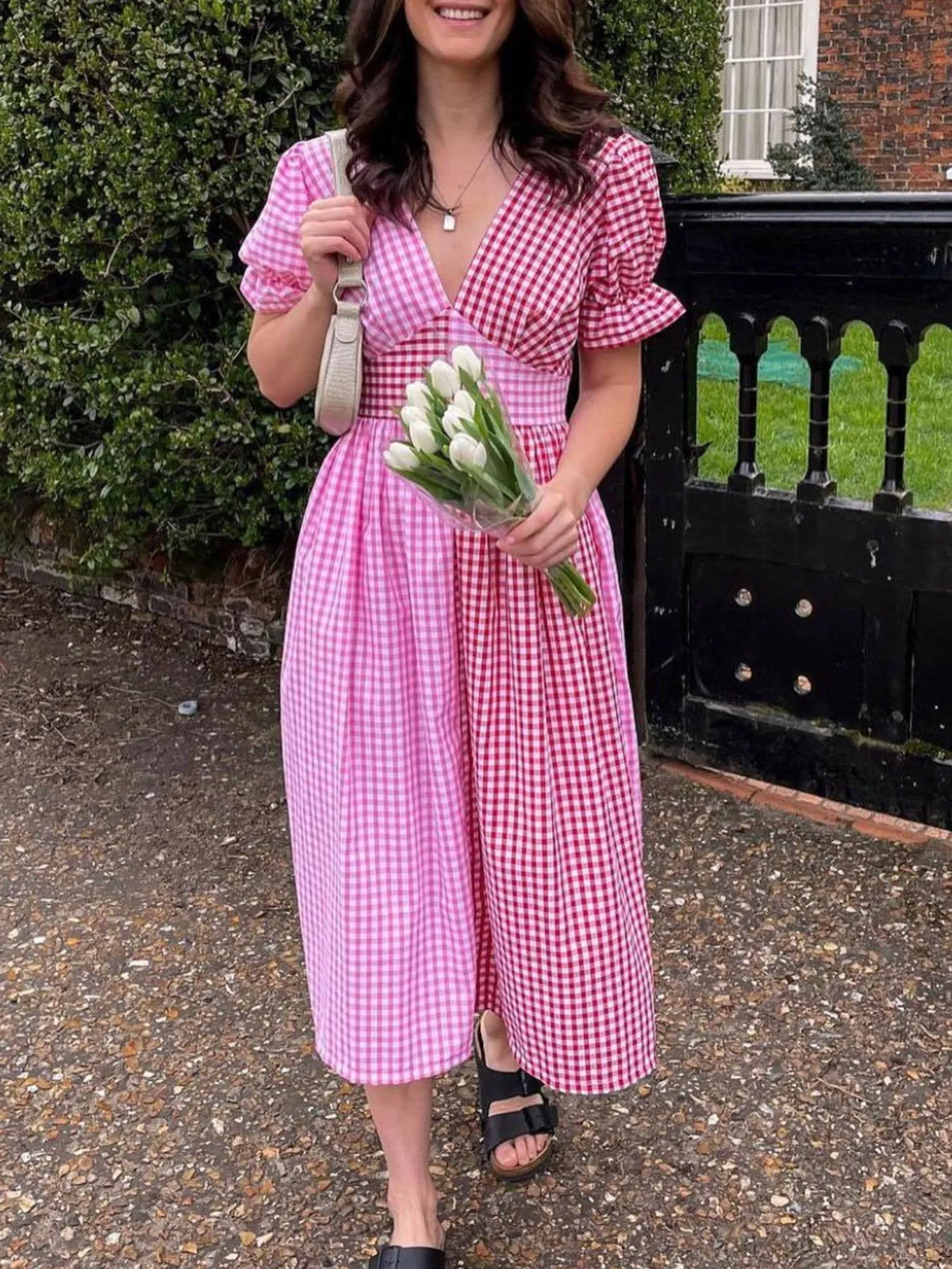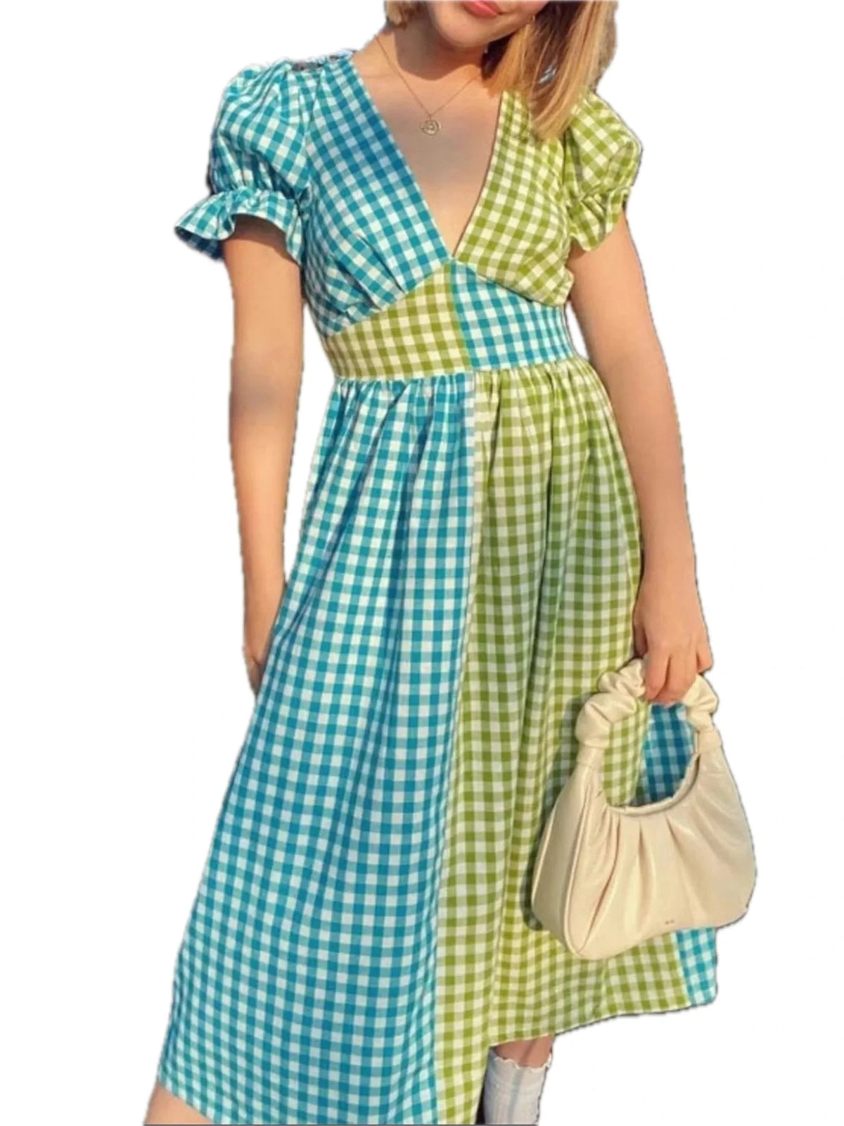 Women's Plaid V Neck Puff Sleeve Dress 100% Polyester Fabric Casual Everyday Wear Flattering Feminine Style Look