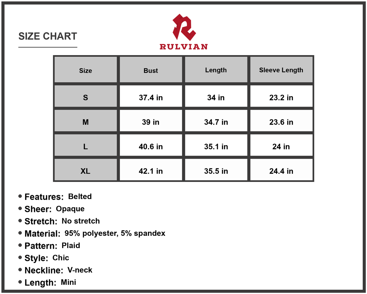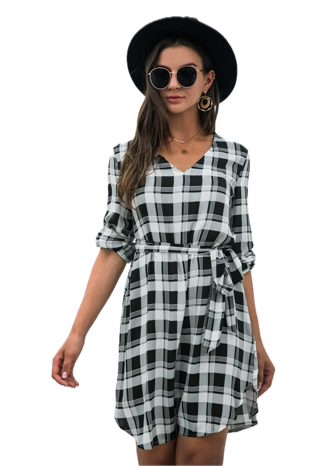 Women's Plaid V Neck Tie Waist Mini Dress Belted Silhouette Ninety Five Percent Polyester and Five Percent Spandex