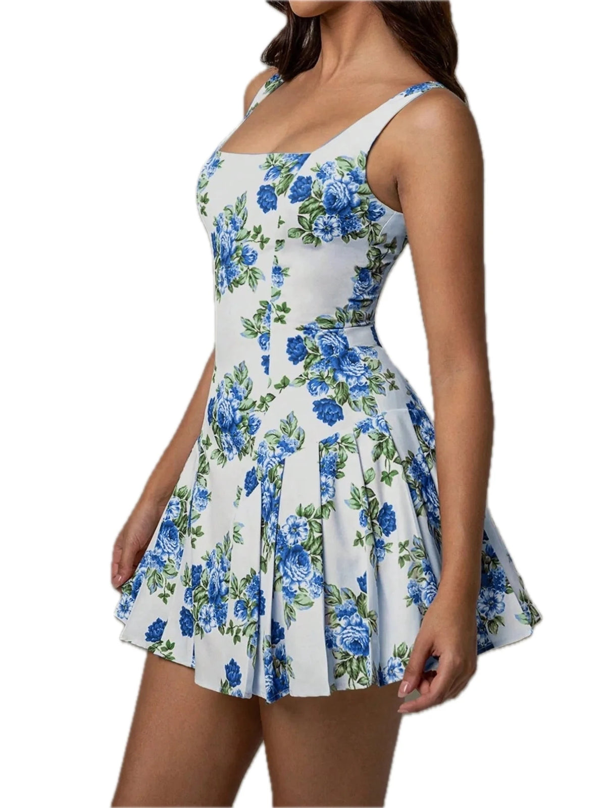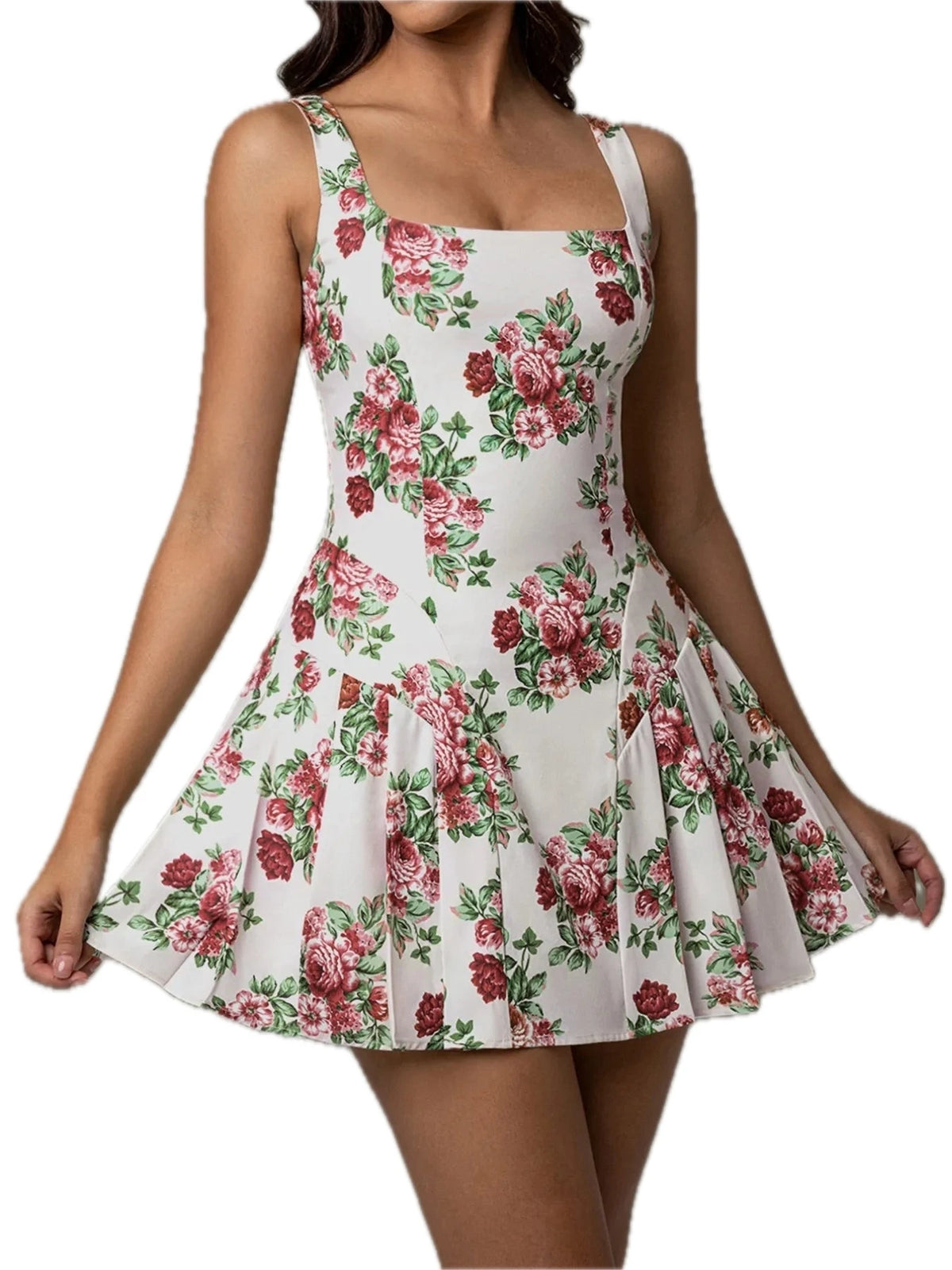 Women's Pleated Floral Print Square Neck Mini Dress with Easy Care Fabric 97% Polyester 3% Elastane Machine Washable