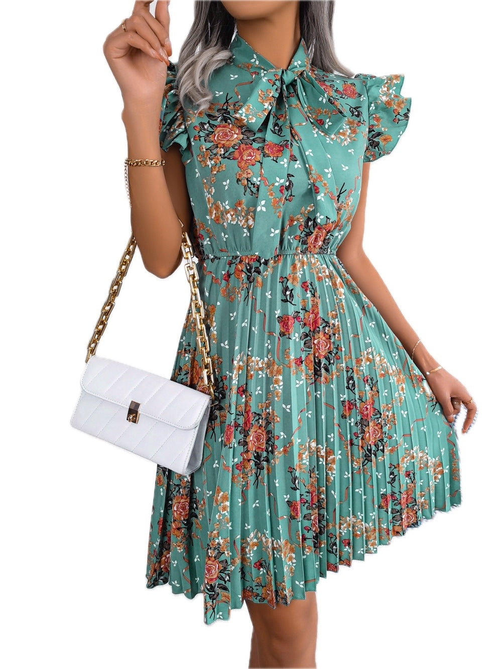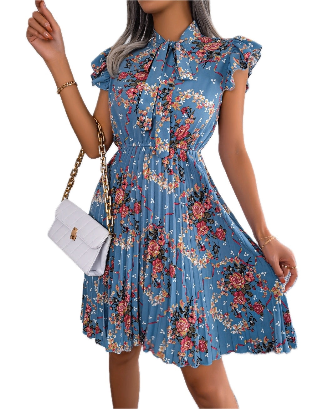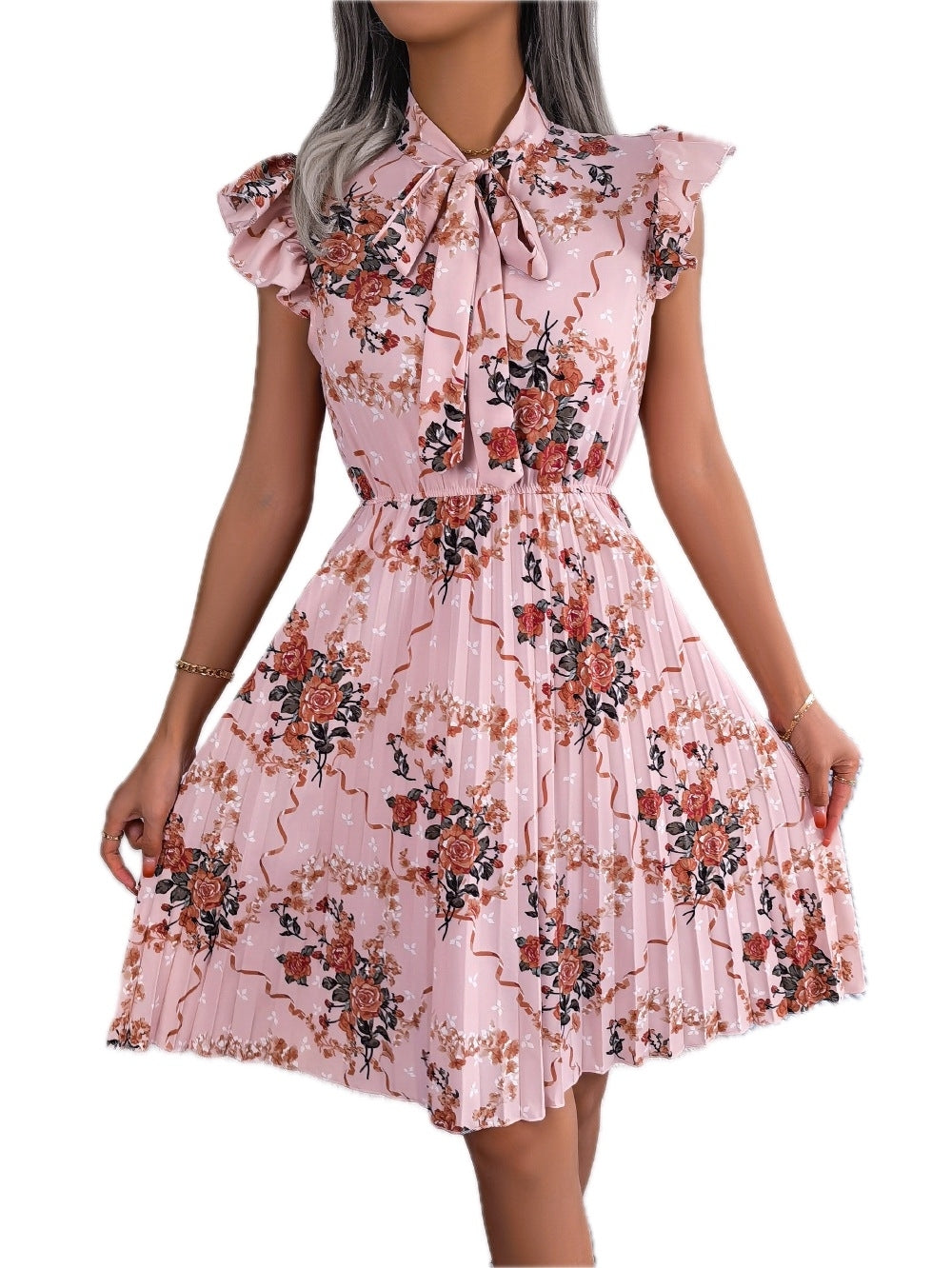 Women's Pleated Floral Printed Tie Neck Knee Length Dress with Cap and Butterfly Sleeves A line Hem 100% Polyester